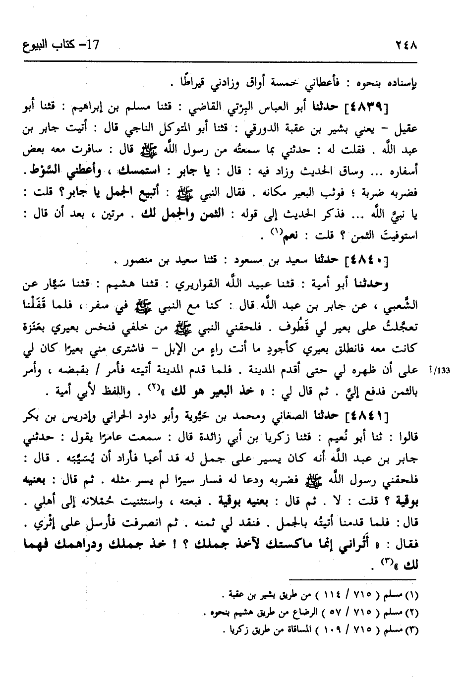 4841 - حَدَّثَنَا الصَّغَانِيُّ، وَمُحَمَّدُ بْنُ حَيَوَيْةِ، وَأَبُو دَاوُدَ الْحَرَّانِيُّ، وَإِدْرِيسُ بْنُ بَكْرٍ قَالُوا: ثَنَا أَبُو نُعَيْمٍ، قثنا زَكَرِيَّا بْنُ أَبِي زَائِدَةَ، قَالَ: سَمِعْتُ عَامِرًا، يَقُولُ: حَدَّثَنِي جَابِرِ بْنِ عَبْدِ اللَّهِ، أَنَّهُ كَانَ " §يَسِيرِ عَلَى جَمَلٍ لَهُ قَدْ أَعْيَا، فَأَرَادَ أَنْ يُسَيِّبَهُ، قَالَ: فَلَحِقَنِي رَسُولُ اللَّهِ صَلَّى اللهُ عَلَيْهِ وَسَلَّمَ، فَضَرَبَهُ وَدَعَا لَهُ، فَسَارَ سَيْرًا لَمْ يَسِرْ مِثْلَهُ، ثُمَّ قَالَ: «بِعْنِيهِ بِوُقِيَّةٍ» . قُلْتُ: لَا، ثُمَّ قَالَ: «بِعْنِيهِ بِوُقِيَّةٍ» ، فَبِعْتُهُ وَاسْتَثْنَيْتُ حِمْلَانَهُ إِلَى أَهْلِي، قَالَ: فَلَمَّا قَدِمْنَا أَتَيْتُهُ بِالْجَمَلِ، فَنَقَدَ لِي ثَمَنَهُ، ثُمَّ انْصَرَفْتُ، فَأَرْسَلَ عَلَى إِثْرِي، فَقَالَ: «أَتُرَانِي إِنَّمَا مَاكَسْتُكَ لِآخُذَ جَمَلَكَ؟ خُذْ جَمَلَكَ وَدَرَاهِمَكَ فَهُمَا لَكَ»