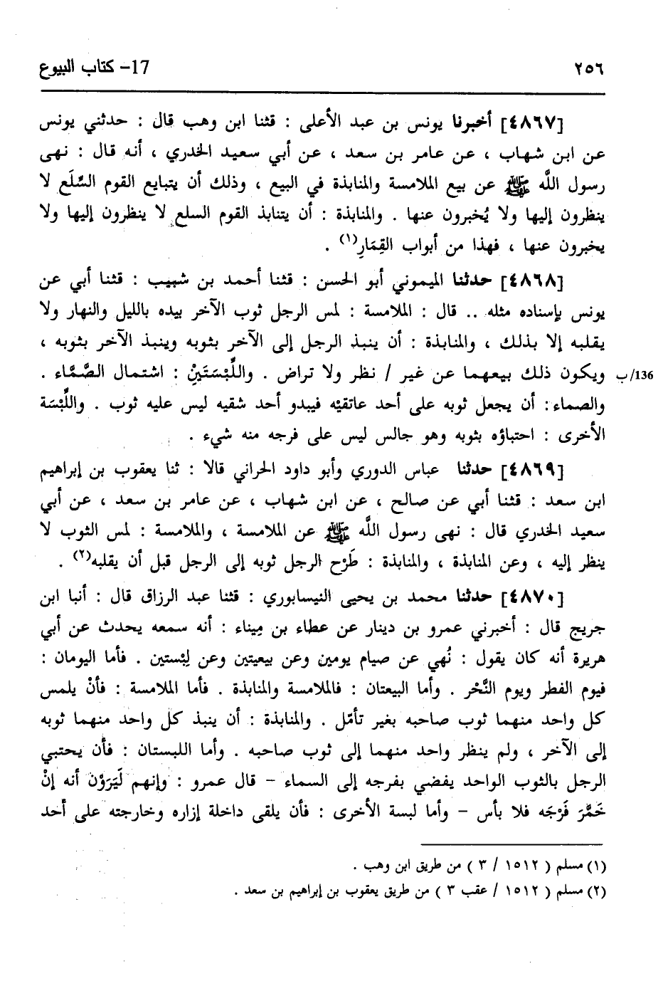 4868 - حَدَّثَنَا الْمَيْمُونِيُّ أَبُو الْحَسَنِ، قثنا أَحْمَدُ بْنُ شَبِيبٍ، قثنا أَبِي، عَنْ يُونُسَ، بِإِسْنَادِهِ مِثْلَهُ قَالَ: §الْمُلَامَسَةُ لَمْسُ الرَّجُلِ ثَوْبَ الْآخَرِ بِيَدِهِ بِاللَّيْلِ وَالنَّهَارِ وَلَا يُقَلِّبُهُ إِلَّا بِذَلِكَ، وَالْمُنَابَذَةُ أَنْ يَنْبِذَ الرَّجُلُ إِلَى الْآخَرِ بِثَوْبِهِ، وَيَنْبِذَ الْآخَرُ بِثَوْبِهِ، وَيَكُونُ ذَلِكَ بَيْعَهُمَا عَنْ غَيْرِ نَظَرٍ وَلَا تَرَاضٍ، وَاللِّبْسَتَيْنِ اشْتِمَالُ الصَّمَّاءِ، وَالصَّمَّاءُ أَنْ يَجْعَلَ ثَوْبَهُ عَلَى أَحَدٍ عَاتِقَيْهِ، فَيَبْدُو أَحَدُ شِقَّيْهِ لَيْسَ عَلَيْهِ ثَوْبٌ، وَاللِّبْسَةُ الْأُخْرَى احْتِبَاؤُهُ بِثَوْبِهِ، وَهُوَ جَالِسٌ لَيْسَ عَلَى فَرْجِهِ مِنْهُ شَيْءٌ "