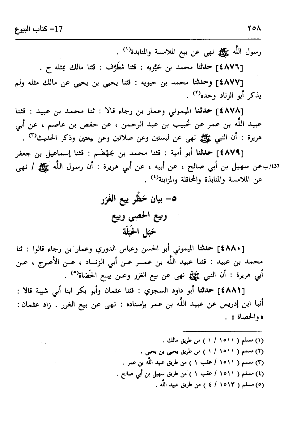 4880 - حَدَّثَنا الْمَيْمُونِيُّ أَبُو الْحَسَنِ، وَعَبَّاسٌ الدُّورِيُّ، وَعَمَّارُ بْنُ رَجَاءٍ، قَالُوا: ثَنَا مُحَمَّدُ بْنُ عُبَيْدٍ، قثنا عُبَيْدُ اللَّهِ بْنُ عُمَرَ، عَنْ أَبِي الزِّنَادِ، عَنِ الْأَعْرَجِ، عَنْ أَبِي هُرَيْرَةَ، أَنَّ النَّبِيَّ صَلَّى اللهُ عَلَيْهِ وَسَلَّمَ «§نَهَى عَنْ بَيْعِ الْغَرَرِ، وَعَنْ بَيْعِ الْحَصَاةِ»