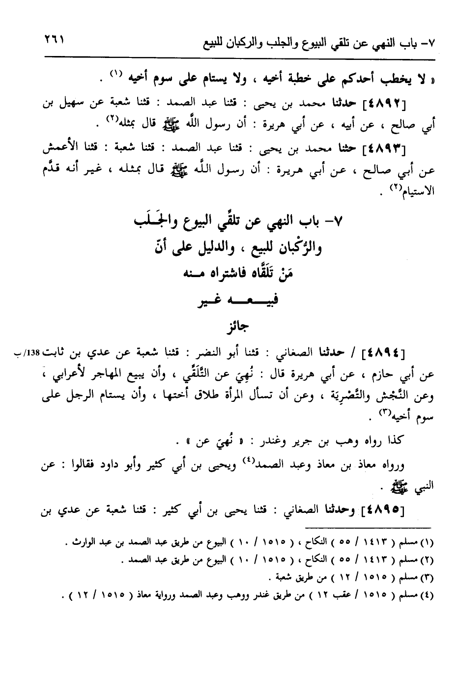 4895 - وَحَدَّثَنَا الصَّغَانِيُّ، قثنا يَحْيَى بْنُ أَبِي بُكَيْرٍ، قثنا شُعْبَةُ، عَنْ عَدِيِّ بْنِ -[262]- ثَابِتٍ، سَمِعْتُ أَبَا حَازِمٍ، عَنْ أَبِي هُرَيْرَةَ، قَالَ شُعْبَةُ: قُلْتُ عَنِ النَّبِيِّ صَلَّى اللهُ عَلَيْهِ وَسَلَّمَ؟ قَالَ: نَعَمْ، قَالَ: «§نُهِيَ عَنِ التَّلَقِّي، وَأَنْ يَبِيعَ الْمُهَاجِرُ الْأَعْرَابِيَّ، وَعَنِ النَّجَشِ، وَالتَّصْرِيَةِ، وَعَنْ أَنْ تَسْأَلَ الْمَرْأَةُ طَلَاقَ أُخْتِهَا، وَأَنْ يَسْتَامَ الرَّجُلُ عَلَى سَوْمِ أَخِيهِ» ،
