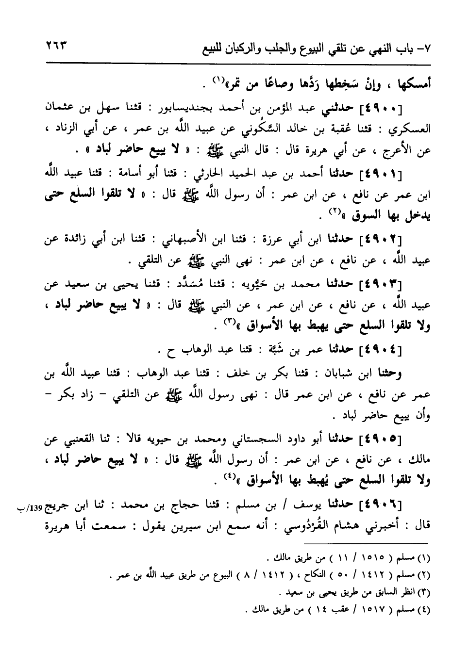 4905 - حَدَّثَنَا أَبُو دَاوُدَ السِّجِسْتَانِيُّ، وَمُحَمَّدُ بْنُ حَيْوَةَ، قَالَا: ثَنَا الْقَعْنَبِيُّ، عَنْ مَالِكٍ، عَنْ نَافِعٍ، عَنِ ابْنِ عُمَرَ، أَنَّ رَسُولَ اللَّهِ صَلَّى اللهُ عَلَيْهِ وَسَلَّمَ قَالَ: «§لَا يَبِيعُ حَاضِرٌ لِبَادٍ، وَلَا تَلَقَّوُا السِّلَعَ حَتَّى يُهْبَطَ بِهَا الْأَسْوَاقُ»