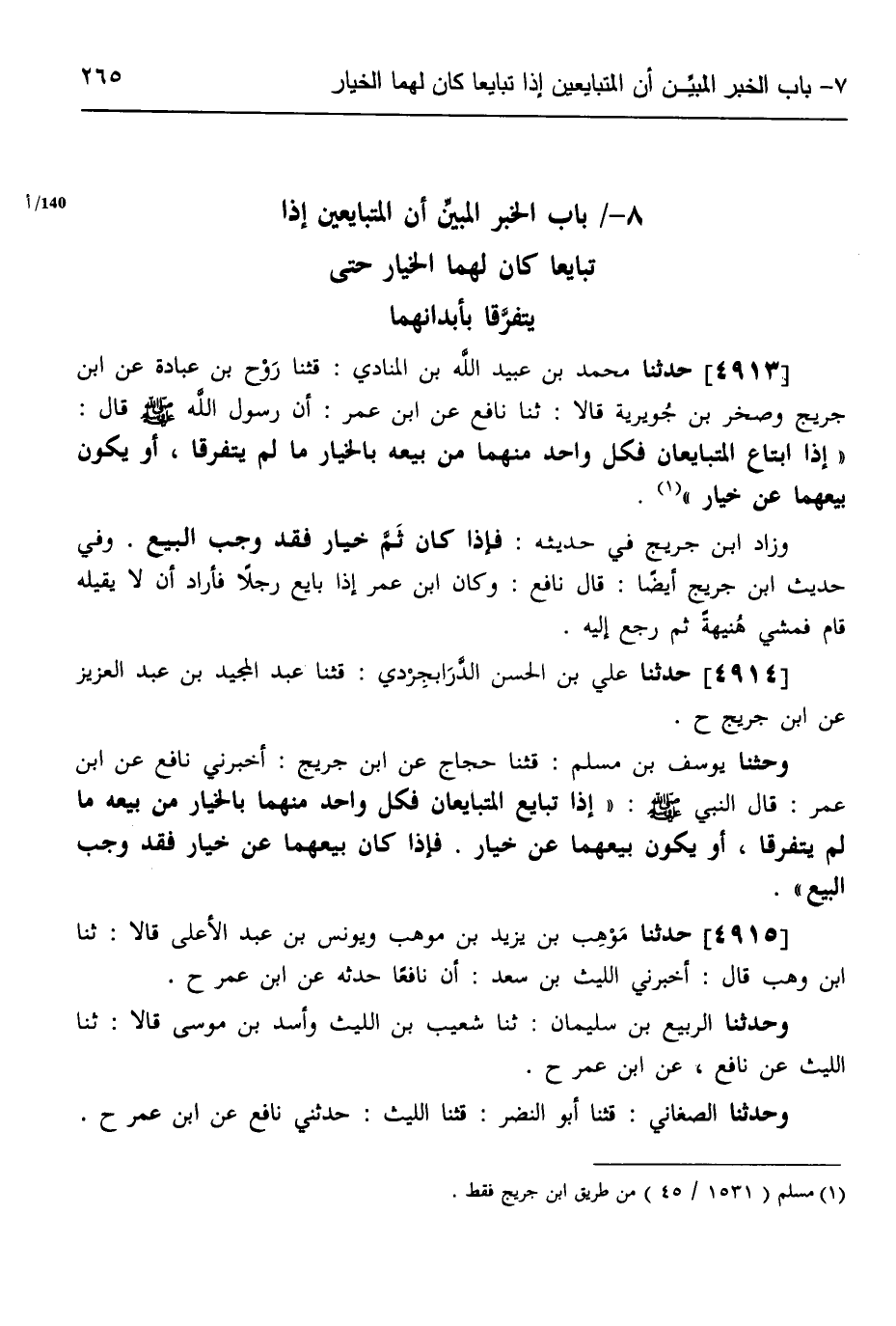 4913 - حَدَّثَنَا مُحَمَّدُ بْنُ عُبَيْدِ اللَّهِ بْنِ الْمُنَادِي، قثنا رَوْحُ بْنُ عُبَادَةَ، عَنِ ابْنِ جُرَيْجٍ، وصَخْرُ بْنُ جُوَيْرِيَةَ، قَالَا: ثَنَا نَافِعٌ، عَنِ ابْنِ عُمَرَ، أَنَّ رَسُولَ اللَّهِ صَلَّى اللهُ عَلَيْهِ وَسَلَّمَ قَالَ: «§إِذَا ابْتَاعَ الْمُتَبَايِعَانِ فَكُلُّ وَاحِدٍ مِنْهُمَا مِنْ بَيْعِهِ بِالْخِيَارِ مَا لَمْ يَتَفَرَّقَا، أَوْ يَكُونُ بَيْعُهُمَا عَنْ خِيَارٍ» وَزَادَ ابْنُ جُرَيْجٍ فِي حَدِيثِهِ «فَإِذَا كَانَ ثَمَّ خِيَارٌ فَقَدْ وَجَبَ الْبَيْعُ» وَفِي حَدِيثِ ابْنِ جُرَيْجٍ أَيْضًا قَالَ نَافِعٌ: وَكَانَ ابْنُ عُمَرَ إِذَا بَايَعَ رَجُلًا فَأَرَادَ أَنْ لَا يُقِيلَهُ قَامَ فَمَشَى هُنَيْهَةً ثُمَّ رَجَعَ إِلَيْهِ