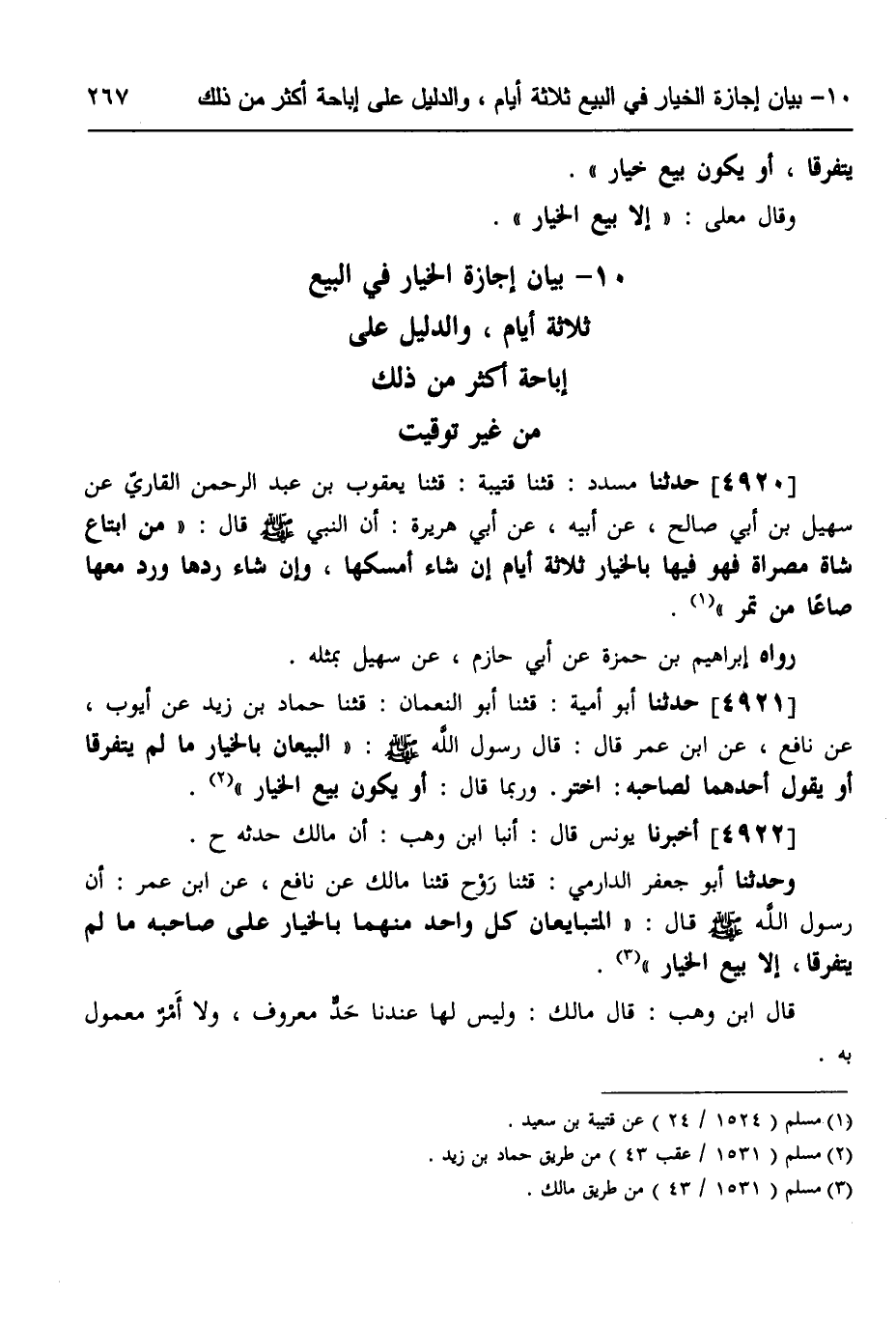4922 - أَخْبَرَنَا يُونُسُ، قَالَ: أنبا ابْنُ وَهْبٍ، أَنَّ مَالِكًا، حَدَّثَهُ ح، وَحَدَّثَنَا أَبُو جَعْفَرٍ الدَّارِمِيُّ، قثنا رَوْحٌ، قثنا مَالِكٌ، عَنْ نَافِعٍ، عَنِ ابْنِ عُمَرَ، أَنَّ رَسُولَ اللَّهِ صَلَّى اللهُ عَلَيْهِ وَسَلَّمَ قَالَ: «§الْمُتَبَايِعَانِ كُلُّ وَاحِدٍ مِنْهُمَا بِالْخِيَارِ عَلَى صَاحِبِهِ مَا لَمْ يَتَفَرَّقَا إِلَّا بَيْعَ الْخِيَارِ» قَالَ ابْنُ وَهْبٍ: قَالَ مَالِكٌ: وَلَيْسَ لَهَا عِنْدَنَا حَدٌّ مَعْرُوفٌ وَلَا أَمْرٌ مَعْمُولٌ بِهِ -[268]-،