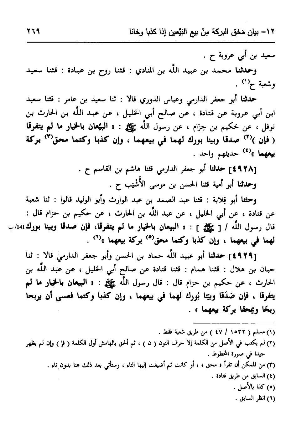 4929 - حَدَّثَنَا أَبُو عُبَيْدِ اللَّهِ حَمَّادُ بْنُ الْحَسَنِ، وَأَبُو جَعْفَرٍ الدَّارِمِيُّ، قَالَا: ثَنَا حِبَّانُ بْنُ هِلَالٍ، قثنا هَمَّامٌ، قثنا قَتَادَةُ، عَنْ صَالِحٍ أَبِي الْخَلِيلِ، عَنْ عَبْدِ اللَّهِ بْنِ الْحَارِثِ، عَنْ حَكِيمِ بْنِ حِزَامٍ، قَالَ: قَالَ رَسُولُ اللَّهِ صَلَّى اللهُ عَلَيْهِ وَسَلَّمَ: «§الْبَيِّعَانِ بِالْخِيَارِ مَا لَمْ يَتَفَرَّقَا فَإِنْ صَدَقَا وَبَيَّنَا بُورِكَ لَهُمَا فِي بَيْعِهِمَا، وَإِنْ كَذِبَا وَكَتَمَا فَعَسَى أَنْ يَرْبَحَا رِبْحًا وَيُمْحَقَا بَرَكَةَ بَيْعِهِمَا» -[270]- قَالَ هَمَّامٌ: وَجَدْتُهُ فِي كِتَابِي «مَا لَمْ يَتَفَرَّقَا أَوْ يَخْتَرْ» ثَلَاثَ مِرَارٍ، قَالَ هَمَّامٌ: وَحَدَّثَنِي أَبُو التَّيَّاحِ أَنَّهُ سَمِعَ عَبْدَ اللَّهِ بْنَ الْحَارِثِ بِهَذَا الْحَدِيثِ عَنْ حَكِيمِ بْنِ حِزَامٍ، عَنِ النَّبِيِّ صَلَّى اللهُ عَلَيْهِ وَسَلَّمَ بِمِثْلِهِ ح.