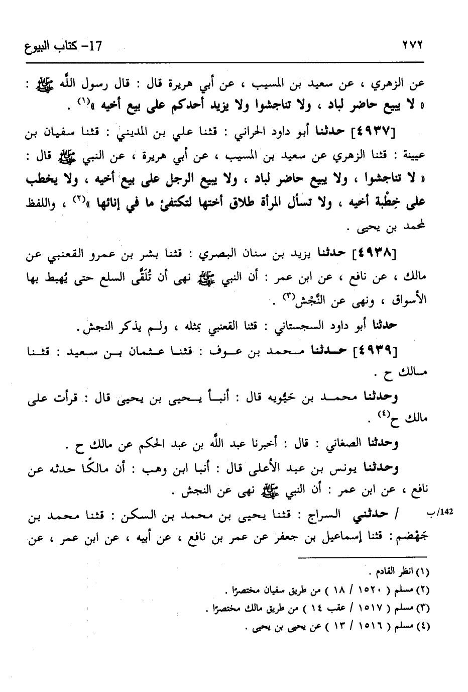 4937 - حَدَّثَنَا أَبُو دَاوُدَ الْحَرَّانِيُّ، قثنا عَلِيُّ بْنُ الْمَدِينِيِّ، قثنا سُفْيَانُ بْنُ عُيَيْنَةَ، قثنا الزُّهْرِيُّ، عَنْ سَعِيدِ بْنِ الْمُسَيِّبِ، عَنْ أَبِي هُرَيْرَةَ، عَنِ النَّبِيِّ صَلَّى اللهُ عَلَيْهِ وَسَلَّمَ قَالَ: «§لَا تَنَاجَشُوا، وَلَا يَبِيعُ حَاضِرٌ لِبَادٍ، وَلَا يَبِيعُ الرَّجُلُ عَلَى بَيْعِ أَخِيهِ، وَلَا يَخْطُبُ عَلَى خِطْبَةِ أَخِيهِ، وَلَا تَسْأَلُ الْمَرْأَةُ طَلَاقَ أُخْتِهَا لِتَكْتَفِئَ مَا فِي إِنَائِهَا» وَاللَّفْظُ لِمُحَمَّدِ بْنِ يَحْيَى