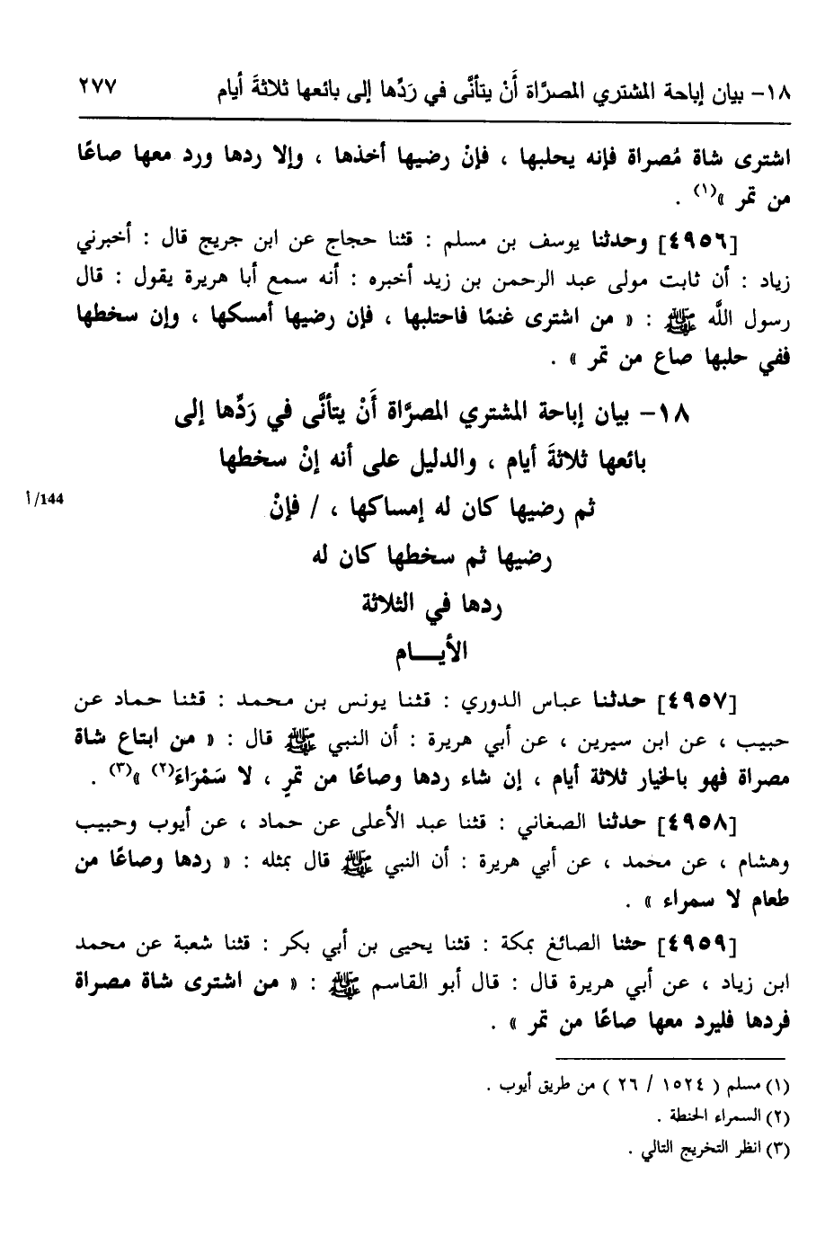 4957 - حَدَّثَنَا عَبَّاسٌ الدُّورِيُّ، قثنا يُونُسُ بْنُ مُحَمَّدٍ، قثنا حَمَّادٌ، عَنْ حَبِيبٍ، عَنِ ابْنِ سِيرِينَ، عَنْ أَبِي هُرَيْرَةَ، أَنَّ النَّبِيَّ صَلَّى اللهُ عَلَيْهِ وَسَلَّمَ قَالَ: «§مَنِ ابْتَاعَ شَاةً مُصَرَّاةً فَهُوَ بِالْخِيَارِ ثَلَاثَةَ أَيَّامٍ إِنْ شَاءَ رَدَّهَا وَصَاعًا مِنْ تَمْرٍ لَا سَمْرَاءَ» ،
