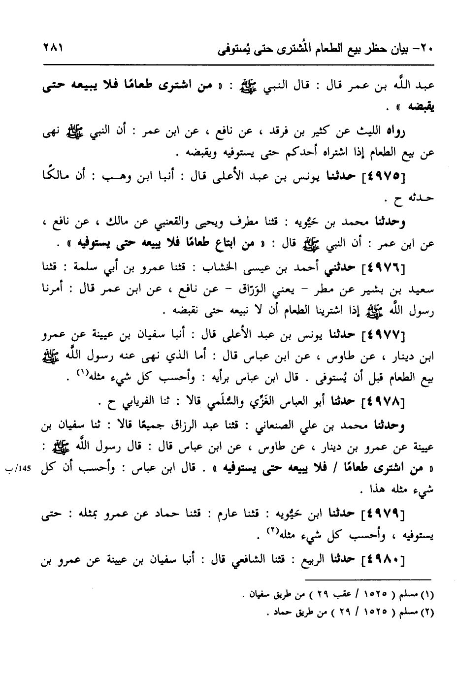 4975 - حَدَّثَنَا يُونُسُ بْنُ عَبْدِ الْأَعْلَى، قَالَ: أنبا ابْنُ وَهْبٍ، أَنَّ مَالِكًا، حَدَّثَهُ ح، وَحَدَّثَنَا مُحَمَّدُ بْنُ حَيَّوَيْهِ، قثنا مُطَرِّفٌ، وَيَحْيَى، وَالْقَعْنَبِيُّ، عَنْ مَالِكٍ، عَنْ نَافِعٍ، عَنِ ابْنِ عُمَرَ، أَنَّ النَّبِيَّ صَلَّى اللهُ عَلَيْهِ وَسَلَّمَ قَالَ: «§مَنِ ابْتَاعَ طَعَامًا، فَلَا يَبِيعُهُ حَتَّى يَسْتَوْفِيَهُ»