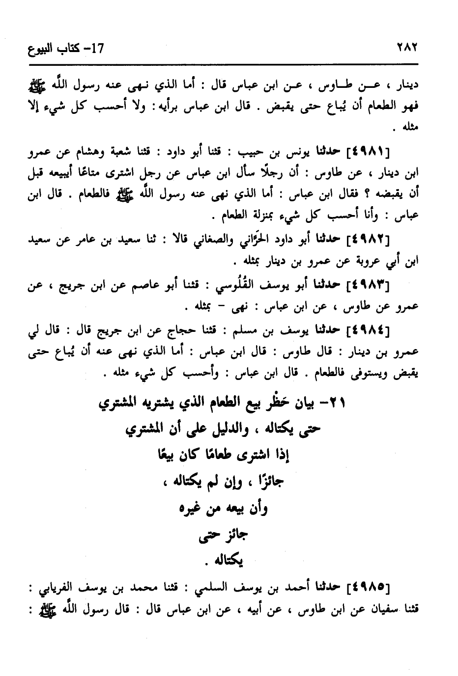 4984 - حَدَّثَنَا يُوسُفُ بْنُ مُسْلِمٍ، قثنا حَجَّاجٌ، عَنِ ابْنِ جُرَيْجٍ، قَالَ: قَالَ لِي عَمْرُو بْنُ دِينَارٍ: قَالَ طَاوُسٌ: قَالَ ابْنُ عَبَّاسٍ: أَمَّا " §الَّذِي نَهَى عَنْهُ أَنْ يُبَاعَ حَتَّى يُقْبَضَ وَيُسْتَوفَى فَالطَّعَامُ قَالَ ابْنُ عَبَّاسٍ وَأَحْسَبُ كُلَّ شَيْءٍ مِثْلَهُ