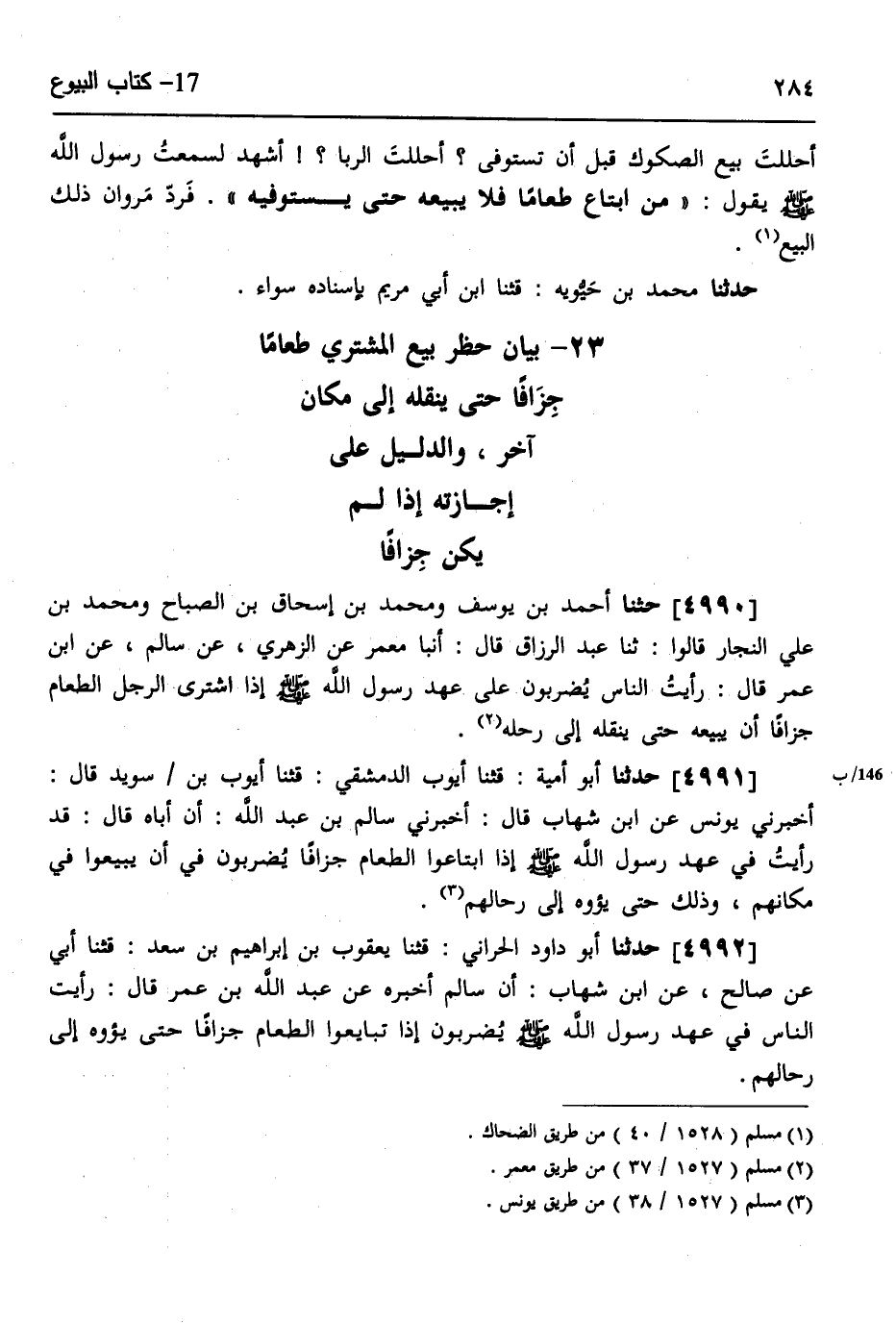 4990 - حثنا أَحْمَدُ بْنُ يُوسُفَ وَمُحَمَّدُ بْنُ إِسْحَاقَ بْنِ الصَّبَّاحِ، وَمُحَمَّدُ بْنُ عَلِيٍّ النَّجَّارُ، قَالُوا: ثَنَا عَبْدُ الرَّزَّاقِ، قَالَ: أنبا مَعْمَرٌ، عَنِ الزُّهْرِيِّ، عَنْ سَالِمٍ، عَنِ ابْنِ عُمَرَ، قَالَ: «§رَأَيْتُ النَّاسَ يُضْرِبُونَ عَلَى عَهْدِ رَسُولِ اللَّهِ صَلَّى اللهُ عَلَيْهِ وَسَلَّمَ إِذَا اشْتَرَى الرَّجُلُ الطَّعَامَ جُزَافًا أَنْ يَبِيعَهُ حَتَّى يَنْقُلَهُ إِلَى رَحْلِهِ»