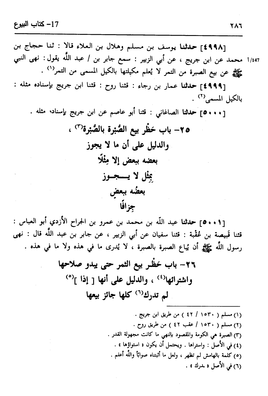 4998 - حَدَّثَنَا يُوسُفُ بْنُ مُسْلِمٍ، وَهِلَالُ بْنُ الْعَلَاءِ، قَالَا: ثَنَا حَجَّاجُ بْنُ مُحَمَّدٍ، عَنِ ابْنِ جُرَيْجٍ، عَنْ أَبِي الزُّبَيْرِ، سَمِعَ جَابِرَ بْنَ عَبْدِ اللَّهِ، يَقُولُ: «§نَهَى النَّبِيُّ صَلَّى اللهُ عَلَيْهِ وَسَلَّمَ عَنْ بَيْعِ الصُّبْرَةِ مِنَ التَّمْرِ لَا يُعْلَمُ مَكِيلَتُهَا بِالْكَيْلِ الْمُسَمَّى مِنَ التَّمْرِ» ،