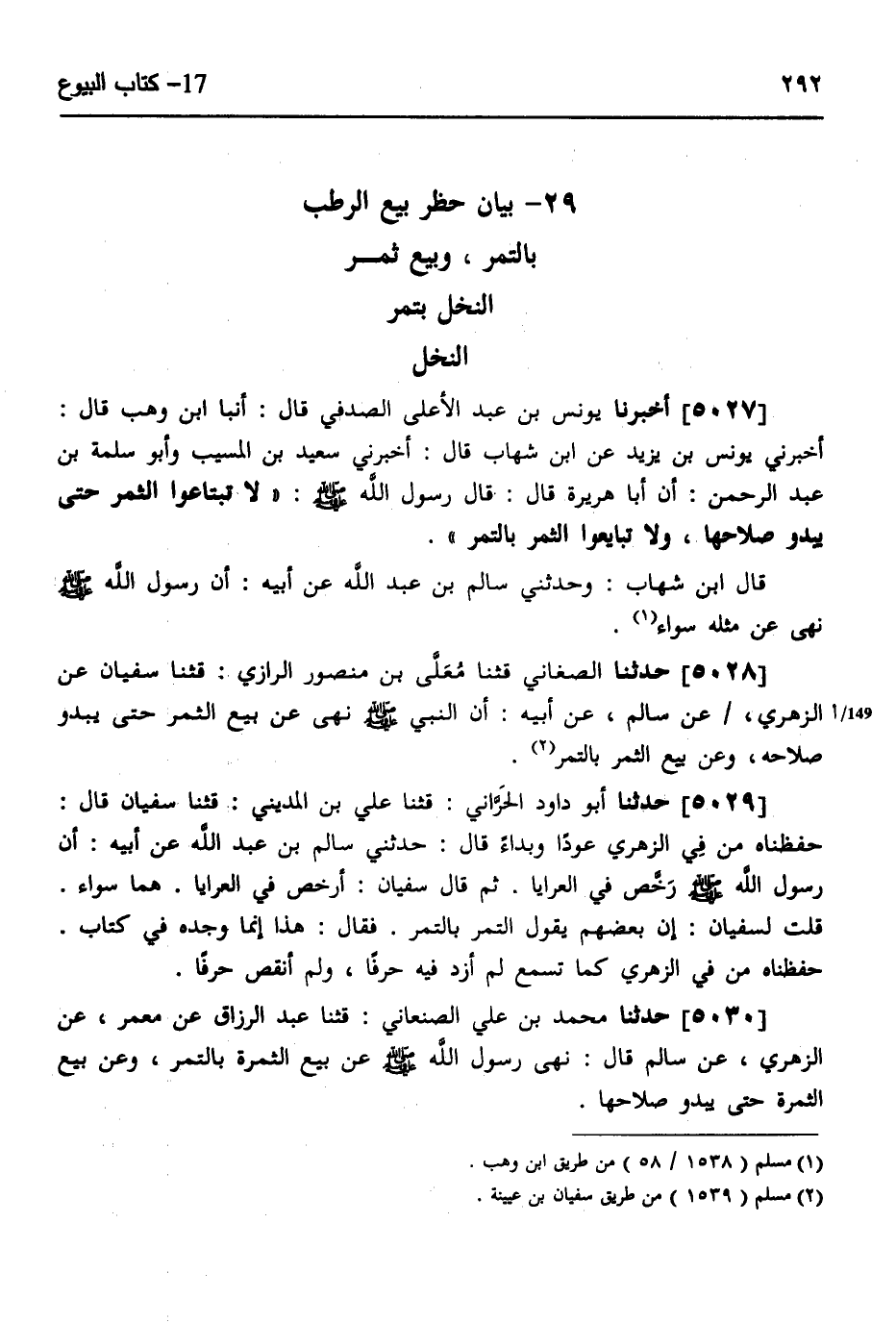 5028 - حَدَّثَنَا الصَّغَانِيُّ، قثنا مُعَلَّى بْنُ مَنْصُورٍ الرَّازِيُّ، قثنا سُفْيَانُ، عَنِ الزُّهْرِيِّ، عَنْ سَالِمٍ، عَنْ أَبِيهِ، أَنَّ النَّبِيَّ صَلَّى اللهُ عَلَيْهِ وَسَلَّمَ «§نَهَى عَنْ بَيْعِ الثَّمَرِ حَتَّى يَبْدُوَ صَلَاحُهُ، وَعَنْ بَيْعِ الثَّمَرِ بِالتَّمْرِ»
