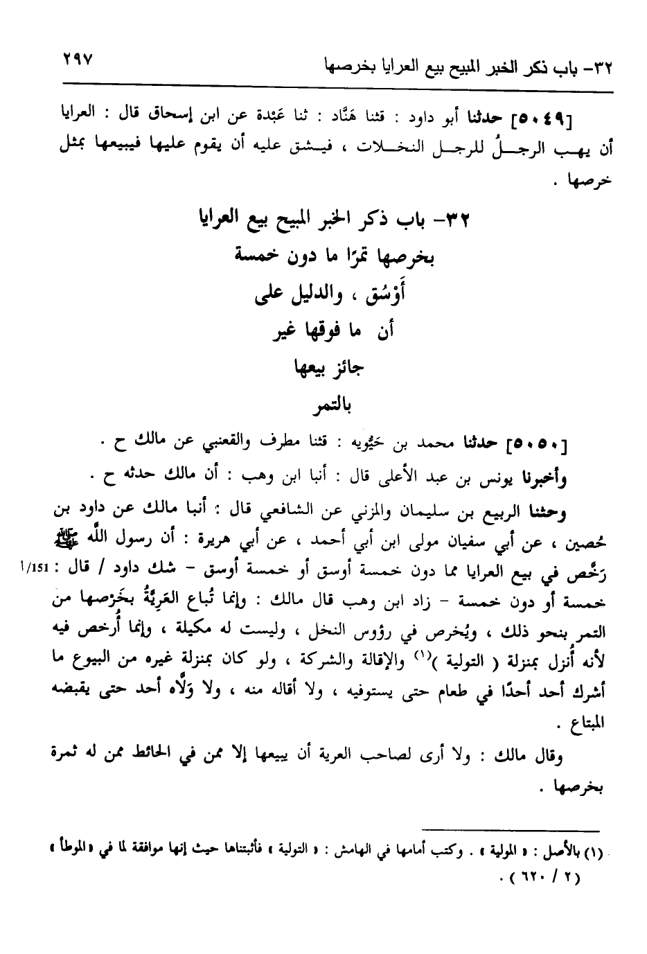 5050 - حَدَّثَنَا مُحَمَّدُ بْنُ حَيَّوَيْهِ، قثنا مُطَرِّفٌ، وَالْقَعْنَبِيُّ، عَنْ مَالِكٍ، ح وَأَخْبَرَنَا يُونُسُ بْنُ عَبْدِ الْأَعْلَى، قَالَ: أنبا ابْنُ وَهْبٍ، أَنَّ مَالِكًا، حَدَّثَهُ ح، وحثنا الرَّبِيعُ بْنُ سُلَيْمَانَ، وَالْمُزَنِيُّ، عَنِ الشَّافِعِيِّ، قَالَ: أنبا مَالِكٌ، عَنْ دَاوُدَ بْنِ حُصَيْنٍ، عَنْ أَبِي سُفْيَانَ، مَوْلَى ابْنِ أَبِي أَحْمَدَ، عَنْ أَبِي هُرَيْرَةَ، أَنَّ رَسُولَ اللَّهِ صَلَّى اللهُ عَلَيْهِ وَسَلَّمَ «§رَخَّصَ فِي بَيْعِ الْعَرَايَا مِمَّا دُونَ خَمْسَةِ أَوْسُقٍ أَوْ خَمْسَةِ أَوْسُقٍ» شَكَّ دَاوُدُ قَالَ: خَمْسَةٌ، أَو دُونَ خَمْسَةٍ، زَادَ ابْنُ وَهْبٍ، قَالَ مَالِكٌ: وَإِنَّمَا تُبَاعُ الْعَرِيَّةُ بِخَرْصِهَا مِنَ التَّمْرِ بِنَحْوِ ذَلِكَ، وَيُخْرَصُ فِي رُءُوسِ النَّخْلِ وَلَيْسَتْ لَهُ مَكِيلَةٌ، وَإِنَّمَا أَرْخَصَ فِيهِ لِأَنَّهُ أنْزِلَ بِمَنْزِلَةِ التَّوْلِيَةِ وَالْإِقَالَةِ وَالشَّرَكِةِ وَلَوْ كَانَ بِمَنْزِلَةِ غَيْرِهِ مِنَ الْبُيُوعِ مَا أَشْرَكَ أَحَدٌ أَحَدًا فِي طَعَامٍ حَتَّى يَسْتَوْفِيَهُ وَلَا أَقَالَهُ مِنْهُ وَلَا وَلَّاهُ أَحَدٌ حَتَّى يَقْبِضَهُ الْمُبْتَاعُ وَقَالَ مَالِكٌ: وَلَا أَرَى لِصَاحِبِ الْعَرِيَّةِ أَنْ يَبِيعَهَا إِلَّا مِمَّنْ فِي الْحَائِطِ مِمَّنْ لَهُ ثَمَرَةٌ بِخَرْصِهَا "