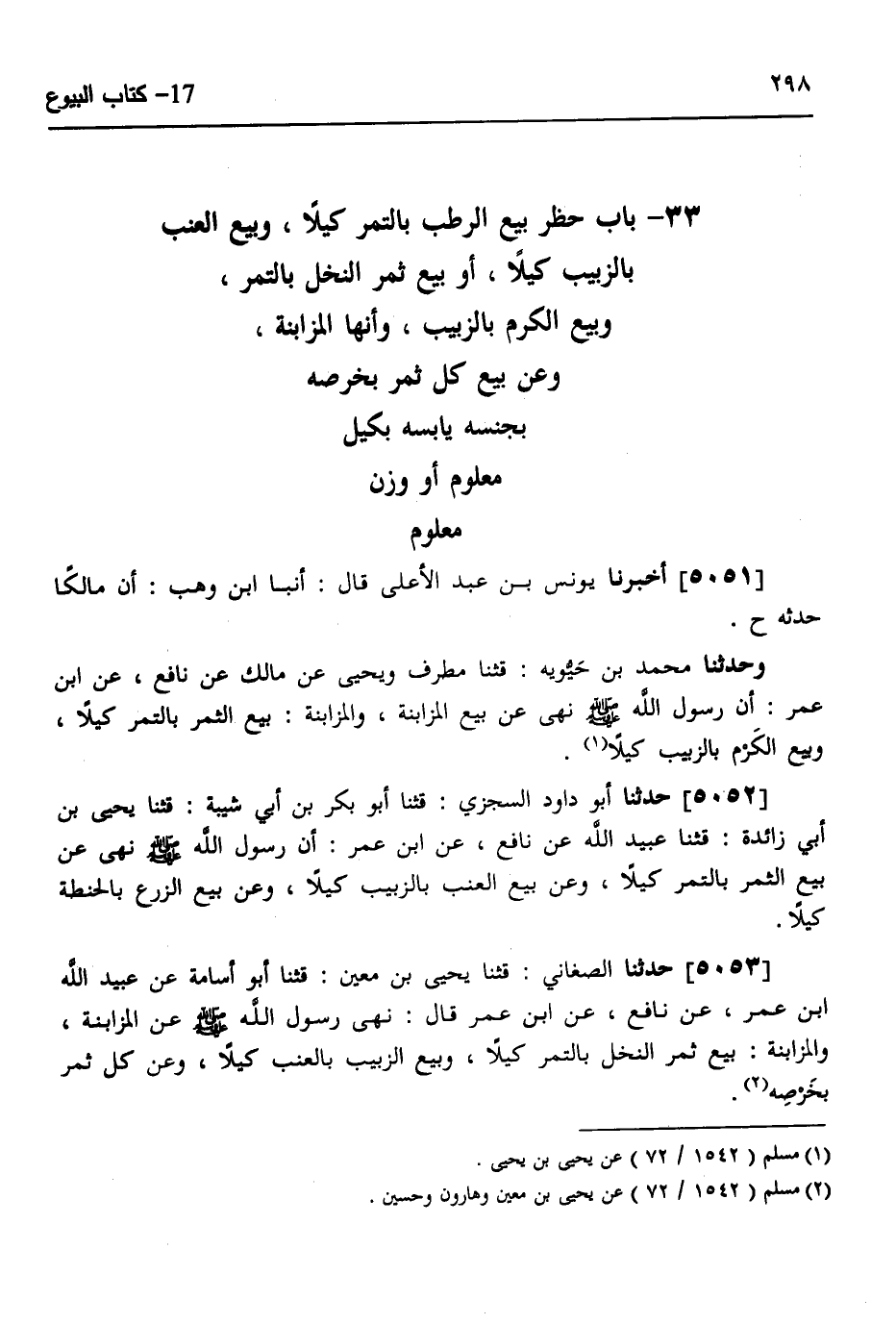 5051 - أَخْبَرَنَا يُونُسُ بْنُ عَبْدِ الْأَعْلَى، قَالَ: أنبا ابْنُ وَهْبٍ، أَنَّ مَالِكًا، حَدَّثَهُ ح، وَحَدَّثَنَا مُحَمَّدُ بْنُ حَيَّوَيْهِ، قثنا مُطَرِّفٌ، وَيَحْيَى، عَنْ مَالِكٍ، عَنِ نَافِعٍ، عَنِ ابْنِ عُمَرَ، أَنَّ رَسُولَ اللَّهِ صَلَّى اللهُ عَلَيْهِ وَسَلَّمَ «§نَهَى عَنْ بَيْعِ الْمُزَابَنَةِ، وَالْمُزَابَنَةُ بَيْعُ الثَّمَرِ بِالتَّمْرِ كَيْلًا وَبَيْعُ الْكَرْمِ بِالزَّبِيبِ كَيْلًا»