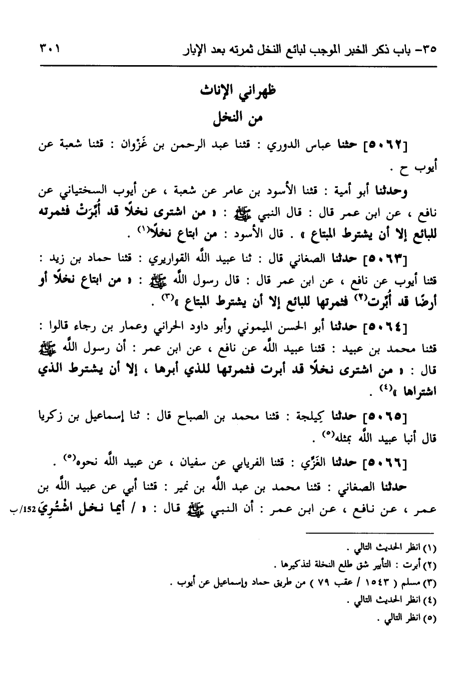 5066 - حَدَّثَنَا الْغَزِّيُّ، قثنا الْفِرْيَابِيُّ، عَنْ سُفْيَانَ، عَنْ عُبَيْدِ اللَّهِ، نَحْوَهُ، حَدَّثَنَا الصَّغَانِيُّ، قثنا مُحَمَّدُ بْنُ عَبْدِ اللَّهِ بْنِ نُمَيْرٍ، قثنا أَبِي، عَنْ عُبَيْدِ اللَّهِ بْنِ عُمَرَ، عَنِ نَافِعٍ، عَنِ ابْنِ عُمَرَ، أَنَّ النَّبِيَّ صَلَّى اللهُ عَلَيْهِ وَسَلَّمَ قَالَ: «§أَيُّمَا نَخْلٍ اشْتُرِيَ -[302]- أصُولُهَا وَقَدْ أبِّرَتْ، فَإِنَّ ثَمَرَتَهَا لِلَّذِي أَبَّرَهَا إِلَّا أَنْ يَشْتَرِطَ الَّذِيِ اشْتَرَاهَا»
