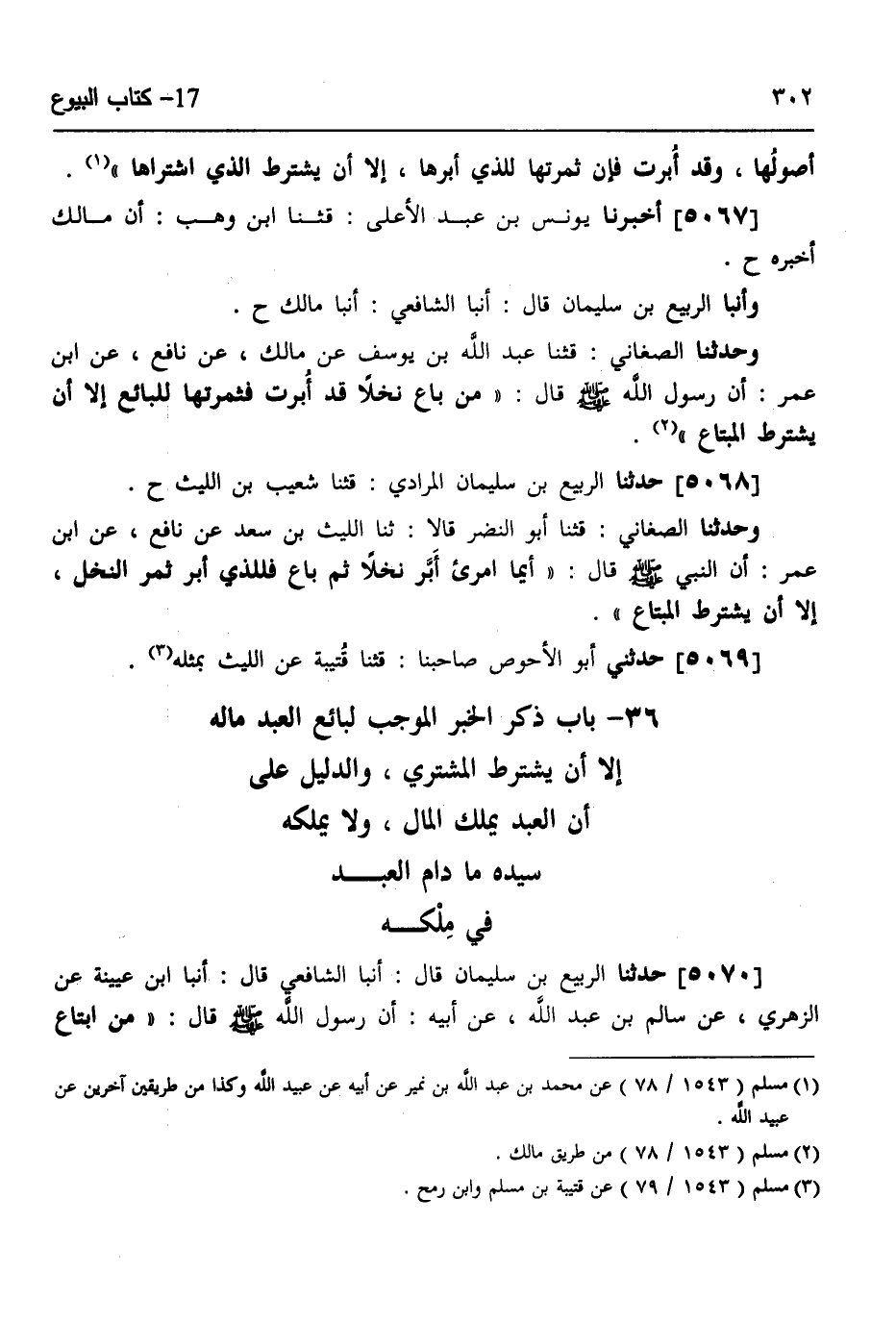 5067 - أَخْبَرَنَا يُونُسُ بْنُ عَبْدِ الْأَعْلَى، قثنا ابْنُ وَهْبٍ، أَنَّ مَالِكًا، أَخْبَرَهُ ح، وأنبا الرَّبِيعُ بْنُ سُلَيْمَانَ، قَالَ: أنبا الشَّافِعِيُّ، أنبا مَالِكٌ، ح وَحَدَّثَنَا الصَّغَانِيُّ، قثنا عَبْدُ اللَّهِ بْنُ يُوسُفَ، عَنْ مَالِكٍ، عَنِ نَافِعٍ، عَنِ ابْنِ عُمَرَ، أَنَّ رَسُولَ اللَّهِ صَلَّى اللهُ عَلَيْهِ وَسَلَّمَ قَالَ: «§مَنْ بَاعَ نَخْلًا قَدْ أبِّرَتْ، فَثَمَرَتُهَا لِلْبَائِعِ إِلَّا أَنْ يَشْتَرِطَ الْمُبْتَاعُ»