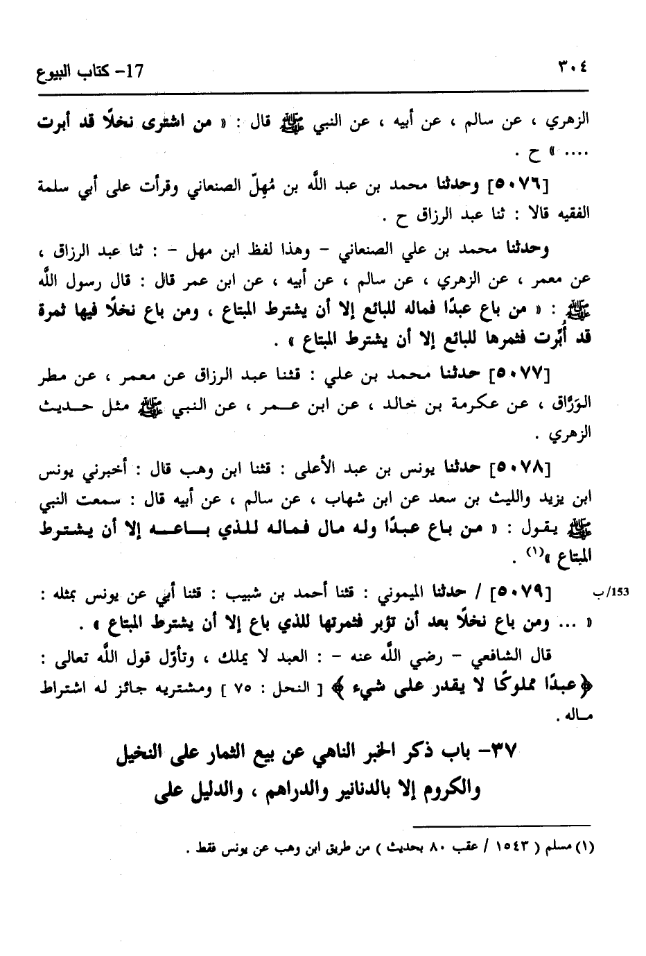 5078 - حَدَّثَنَا يُونُسُ بْنُ عَبْدِ الْأَعْلَى، قثنا ابْنُ وَهْبٍ، قَالَ: أَخْبَرَنِي يُونُسُ بْنُ يَزِيدَ، وَاللَّيْثِ بْنِ سَعْدٍ، عَنِ ابْنِ شِهَابٍ، عَنْ سَالِمٍ، عَنْ أَبِيهِ، قَالَ: سَمِعْتُ النَّبِيَّ صَلَّى اللهُ عَلَيْهِ وَسَلَّمَ يَقُولُ: «§مِنْ بَاعَ عَبْدًا وَلَهُ مَالٌ فَمَالُهُ لِلَّذِي بَاعَهُ إِلَّا أَنْ يَشْتَرِطَ الْمُبْتَاعُ»