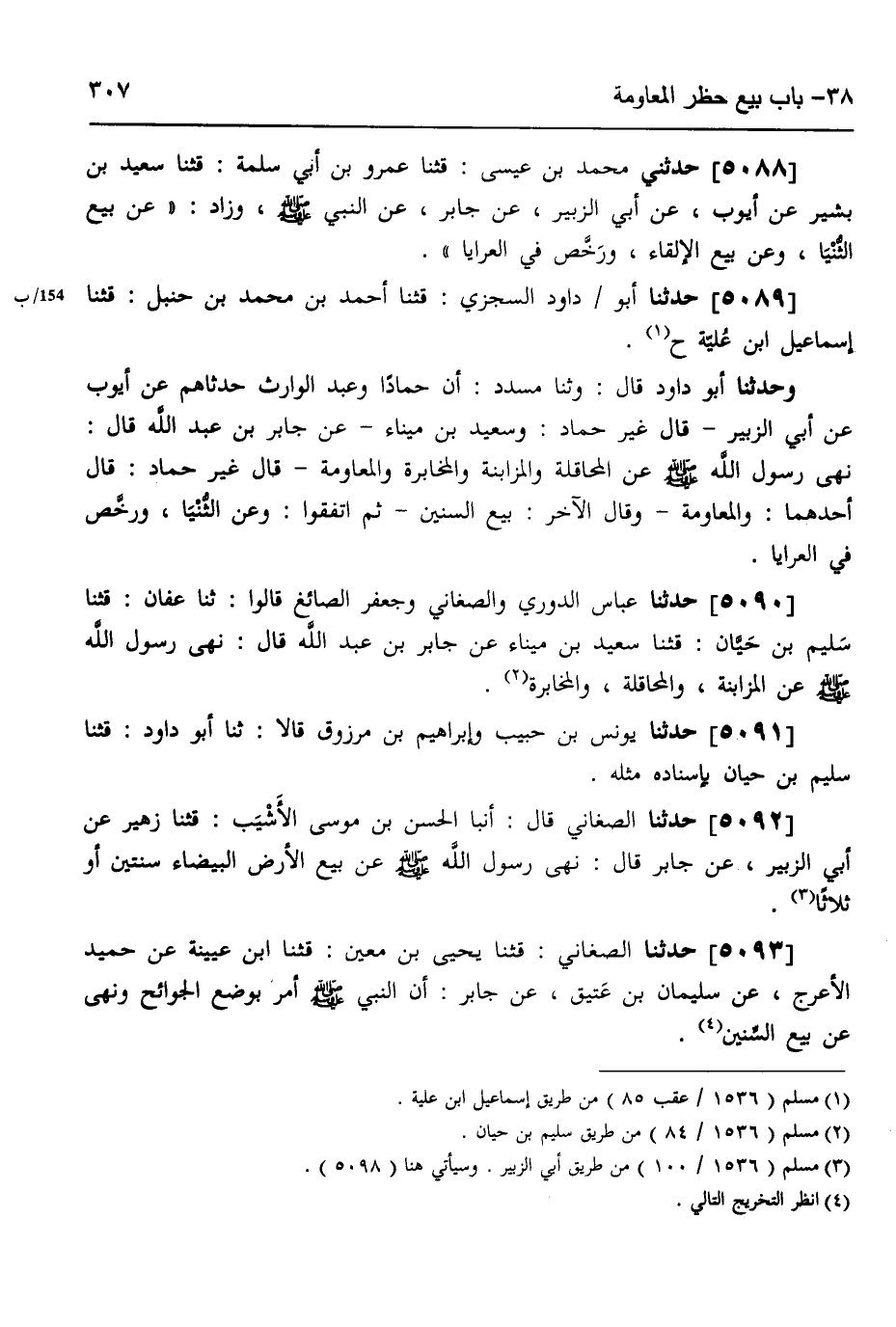 5089 - حَدَّثَنَا أَبُو دَاوُدَ السِّجْزِيُّ، قثنا أَحْمَدُ بْنُ مُحَمَّدِ بْنِ حَنْبَلٍ، قثنا: إِسْمَاعِيلُ ابْنُ عُلَيَّةَ، ح وَحَدَّثَنَا أَبُو دَاوُدَ، قَالَ: وَثَنَا مُسَدَّدٌ، أَنَّ حَمَّادًا، وَعَبْدَ الْوَارِثِ، حَدَّثَاهُمْ عَنْ أَيُّوبَ، عَنْ أَبِي الزُّبَيْرِ، قَالَ: غَيْرُ حَمَّادٍ وَسَعِيدِ بْنِ مِينَاءَ عَنْ جَابِرِ بْنِ عَبْدِ اللَّهِ، قَالَ: " §نَهَى رَسُولُ اللَّهِ صَلَّى اللهُ عَلَيْهِ وَسَلَّمَ عَنِ الْمُحَاقَلَةِ، وَالْمُزَابَنَةِ، وَالْمُخَابَرَةِ، وَالْمُعَاوَمَةِ، قَالَ: غَيْرُ حَمَّادَ: قَالَ أَحَدُهُمَا: «وَالْمُعَاوَمَةِ» وَقَالَ الْآخَرُ: «بَيْعِ السِّنِينَ» ، ثُمَّ اتَّفَقُوا وَعَنِ الثُّنْيَا وَرَخَّصَ فِي الْعَرَايَا "