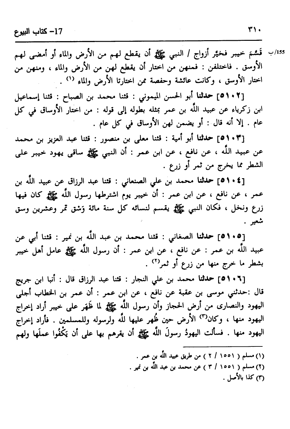 5104 - حَدَّثَنَا مُحَمَّدُ بْنُ عَلِيٍّ الصَّنْعَانِيُّ، قثنا عَبْدُ الرَّزَّاقِ، عَنْ عُبَيْدِ اللَّهِ بْنِ عُمَرَ، عَنِ نَافِعٍ، عَنِ ابْنِ عُمَرَ، أَنَّ خَيْبَرَ، يَوْمَ اشْتَرَطَهَا رَسُولُ اللَّهِ صَلَّى اللهُ عَلَيْهِ وَسَلَّمَ كَانَ فِيهَا زَرْعٌ وَنَخْلٌ، فَكَانَ النَّبِيُّ صَلَّى اللهُ عَلَيْهِ وَسَلَّمَ «§يَقْسِمُ لِنِسَائِهِ كُلَّ سَنَةٍ مِائَةَ وَسْقِ تَمْرٍ وَعِشْرِينَ وَسْقِ شَعِيرٍ»