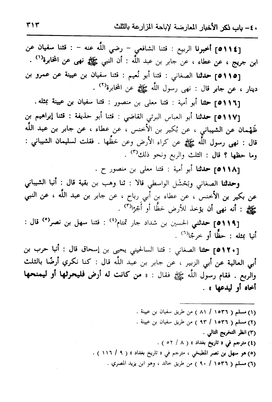 5120 - حثنا الصَّغَانِيُّ، قثنا السَّالَحِينِيُّ، يَحْيَى بْنُ إِسْحَاقَ قَالَ: أنبا حَرْبُ بْنُ أَبِي الْعَالِيَةِ، عَنْ أَبِي الزُّبَيْرِ، عَنْ جَابِرِ بْنِ عَبْدِ اللَّهِ، قَالَ: كُنَّا نُكْرِي أَرْضًا بِالثُّلُثِ وَالرُّبُعِ، فَقَامَ رَسُولُ اللَّهِ صَلَّى اللهُ عَلَيْهِ وَسَلَّمَ، فَقَالَ: «§مَنْ كَانَتْ لَهُ أَرْضٌ، فَلْيُحْرُثْهَا، أَوْ لِيَمْنَحْهَا أَخَاهُ، أَوْ لِيَدَعْهَا»