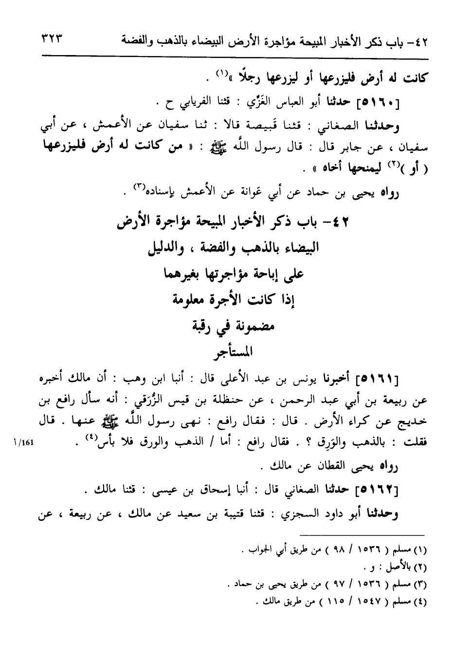 5162 - حَدَّثَنَا الصَّغَانِيُّ، قَالَ: أنبا إِسْحَاقُ بْنُ عِيسَى، قثنا مَالِكٌ، وَحَدَّثَنَا أَبُو دَاوُدَ السِّجْزِيُّ، قثنا قُتَيْبَةُ بْنُ سَعِيدٍ، عَنْ مَالِكٍ، عَنْ رَبِيعَةَ، عَنْ -[324]- حَنْظَلَةَ بْنِ قَيْسٍ، أَنَّهُ سَأَلَ رَافِعَ بْنَ خَدِيجٍ عَنْ كِرَاءِ الْأَرْضِ، فَقَالَ: " §نَهَى رَسُولُ اللَّهِ صَلَّى اللهُ عَلَيْهِ وَسَلَّمَ عَنْ كِرَاءِ الْأَرْضِ، فَقُلْتُ أَنَا: بِالذَّهَبِ وَالْفِضَّةِ، فَقَالَ: أَمَّا بِالذَّهَبِ وَالْفِضَّةِ فَلَا بَأْسَ "