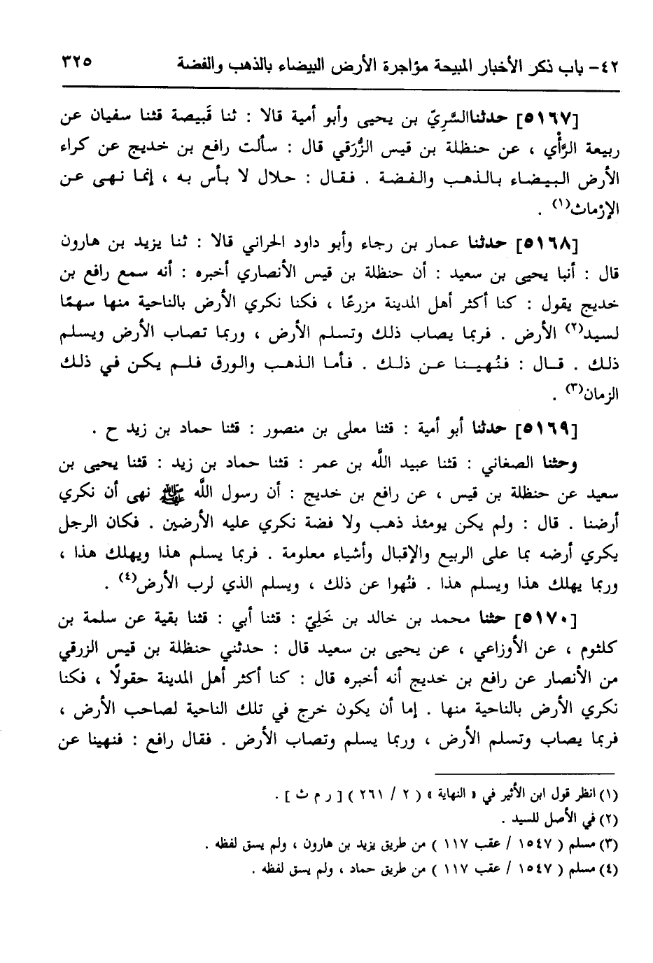 5169 - حَدَّثَنَا أَبُو أُمَيَّةَ، قثنا مُعَلَّى بْنُ مَنْصُورٍ، قثنا حَمَّادُ بْنُ زَيْدٍ، ح وَحثنا الصَّغَانِيُّ، قثنا عُبَيْدُ اللَّهِ بْنُ عُمَرَ، قثنا حَمَّادُ بْنُ زَيْدٍ، قثنا يَحْيَى بْنُ سَعِيدٍ، عَنْ حَنْظَلَةَ بْنِ قَيْسٍ، عَنْ رَافِعِ بْنِ خَدِيجٍ، أَنَّ رَسُولَ اللَّهِ صَلَّى اللهُ عَلَيْهِ وَسَلَّمَ " §نَهَى أَنْ نُكْرِيَ أَرْضَنَا قَالَ: وَلَمْ يَكُنْ يَوْمَئِذٍ ذَهَبٌ، وَلَا فِضَّةٌ نُكْرِي عَلَيْهِ الْأَرَضِينَ، فَكَانَ الرَّجُلُ يُكْرِي أَرْضَهُ بِمَا عَلَى الرَّبِيعِ، وَالْإِقْبَالِ وَأَشْيَاءَ مَعْلُومَةٍ، فَرُبَّمَا يَسْلَمُ هَذَا وَيَهْلِكُ هَذَا وَرُبَّمَا يَهْلِكُ هَذَا، وَيَسْلَمُ هَذَا، فَنُهُوا عَنْ ذَلِكَ وَيَسْلَمُ الَّذِي لِرَبِّ الْأَرْضِ "