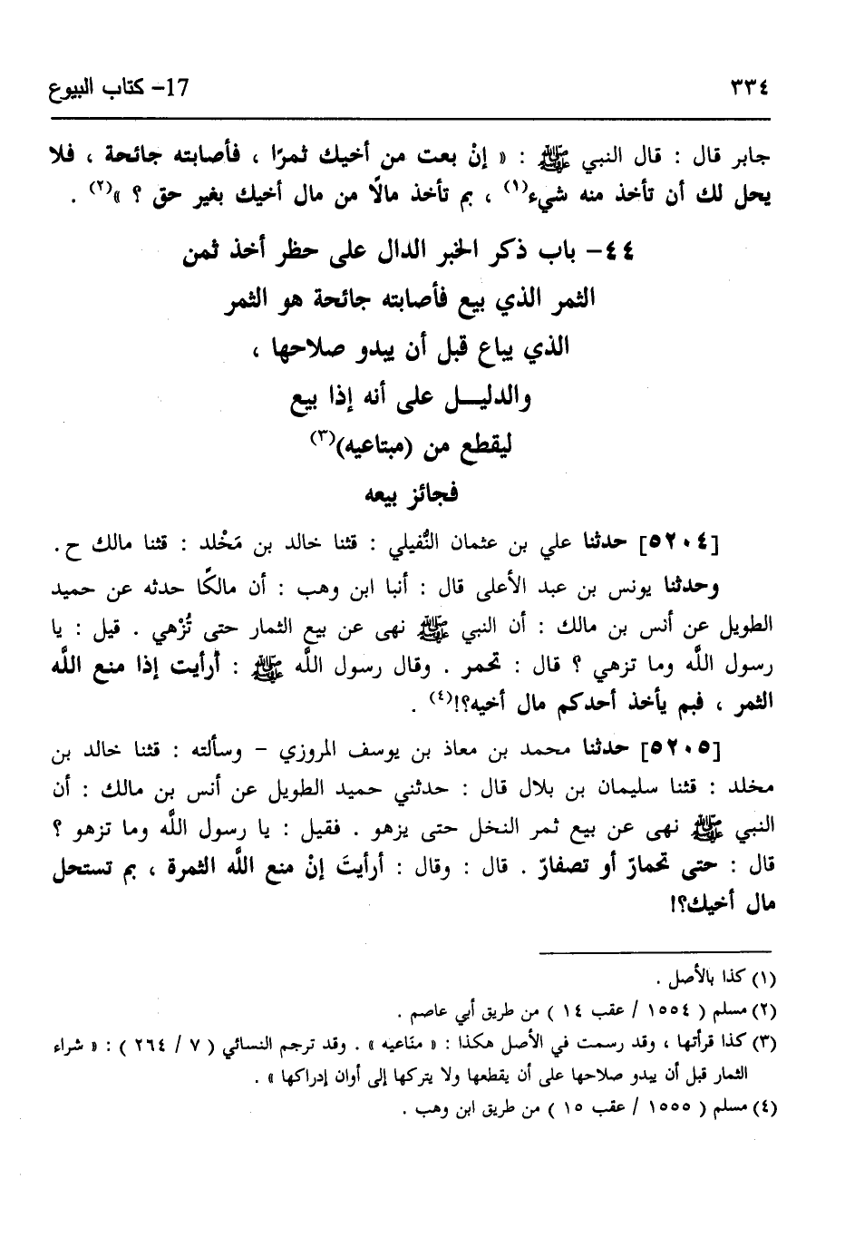 5204 - حَدَّثَنَا عَلِيُّ بْنُ عُثْمَانَ النُّفَيْلِيُّ، قثنا خَالِدُ بْنُ مَخْلَدٍ، قثنا مَالِكٌ، ح وَحَدَّثَنَا يُونُسُ بْنُ عَبْدِ الْأَعْلَى، قَالَ: أنبا ابْنُ وَهْبٍ، أَنَّ مَالِكًا، حَدَّثَهُ عَنْ حُمَيْدٍ الطَّوِيلِ، عَنْ أَنَسِ بْنِ مَالِكٍ، أَنَّ النَّبِيَّ صَلَّى اللهُ عَلَيْهِ وَسَلَّمَ نَهَى عَنْ بَيْعِ الثِّمَارِ حَتَّى تُزْهِيَ قِيلَ: يَا رَسُولَ اللَّهِ، وَمَا تُزْهِيَ؟ قَالَ: «تَحْمَرُّ» وَقَالَ رَسُولُ اللَّهِ صَلَّى اللهُ عَلَيْهِ وَسَلَّمَ: «§أَرَأَيْتَ إِذَا مَنَعَ اللَّهُ الثَّمَرَ؟ فَبِمَ يَأْخُذُ أَحَدُكُمْ مَالَ أَخِيهِ؟»