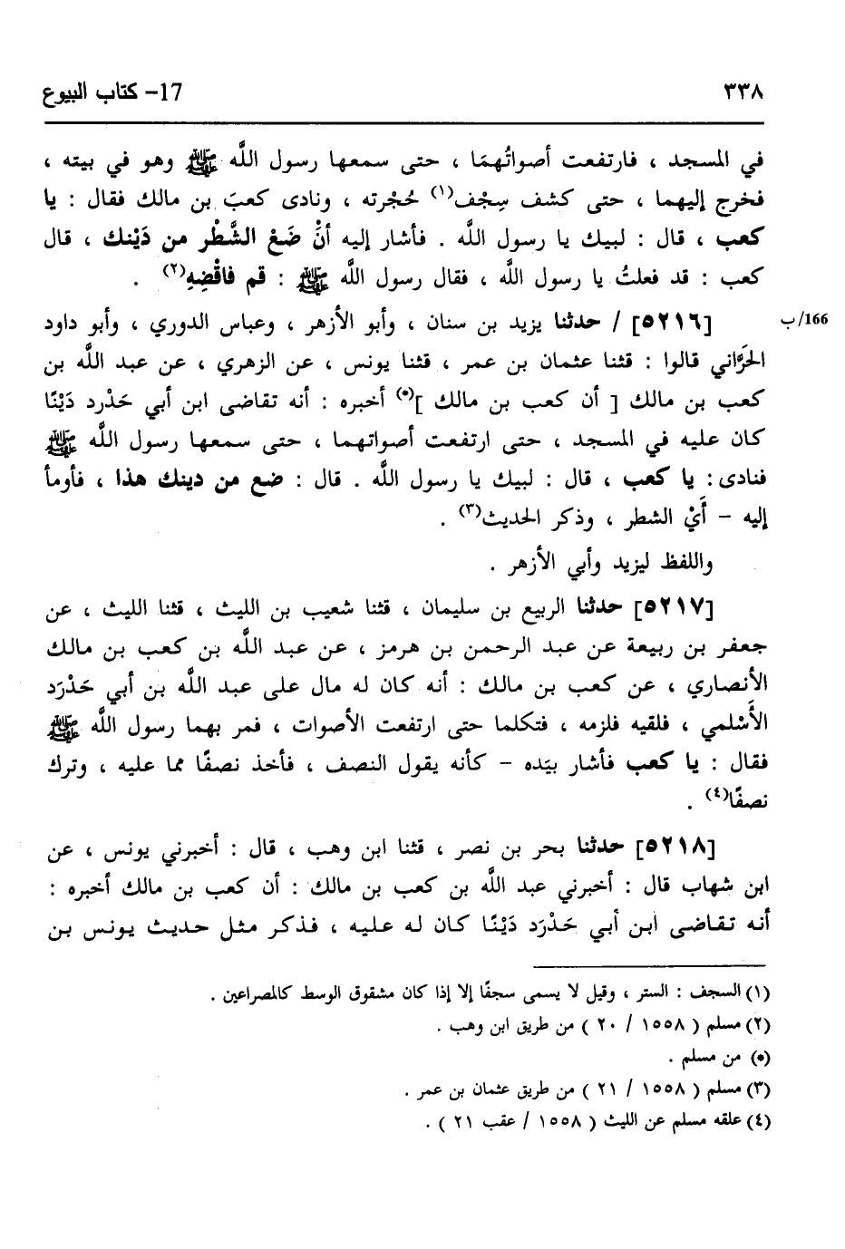 5217 - حَدَّثَنَا الرَّبِيعُ بْنُ سُلَيْمَانَ، قثنا شُعَيْبُ بْنُ اللَّيْثِ، قثنا اللَّيْثُ، عَنْ جَعْفَرِ بْنِ رَبِيعَةَ، عَنْ عَبْدِ الرَّحْمَنِ بْنِ هُرْمُزَ، عَنْ عَبْدِ اللَّهِ بْنِ كَعْبِ بْنِ مَالِكٍ الْأَنْصَارِيِّ، عَنْ كَعْبِ بْنِ مَالِكٍ، أَنَّهُ كَانَ §لَهُ مَالٌ عَلَى عَبْدِ اللَّهِ بْنِ أَبِي حَدْرَدٍ الْأَسْلَمِيِّ، فَلَقِيَهُ فَلَزِمَهُ، فَتَكَلَّمَا حَتَّى ارْتَفَعَتِ الْأَصْوَاتُ، فَمَرَّ بِهِمَا رَسُولُ اللَّهِ صَلَّى اللهُ عَلَيْهِ وَسَلَّمَ فَقَالَ: «يَا كَعْبُ» فَأَشَارَ بِيَدِهِ كَأَنَّهُ يَقُولُ النِّصْفَ، فَأَخَذَ نِصْفًا مِمَّا عَلَيْهِ وَتَرَكَ نِصْفًا،