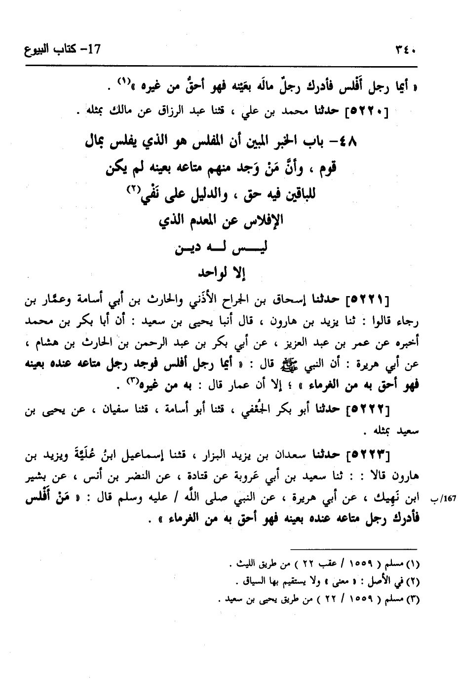 5223 - حَدَّثَنَا سَعْدَانُ بْنُ يَزِيدَ الْبَزَّارُ، قثنا إِسْمَاعِيلُ ابْنُ عُلَيَّةَ، وَيَزِيدُ بْنُ هَارُونَ، قَالَا: ثَنَا سَعِيدُ بْنُ أَبِي عَرُوبَةَ، عَنْ قَتَادَةَ، عَنِ النَّضْرِ بْنِ أَنَسٍ، عَنْ بَشِيرِ بْنِ نَهِيكٍ، عَنْ أَبِي هُرَيْرَةَ، عَنِ النَّبِيِّ صَلَّى اللهُ عَلَيْهِ وَسَلَّمَ قَالَ: «§مَنْ أَفْلَسَ فَأَدْرَكَ رَجُلٌ مَتَاعَهُ عِنْدَهُ بِعَيْنِهِ، فَهُوَ أَحَقُّ بِهِ مِنَ الْغُرَمَاءِ»
