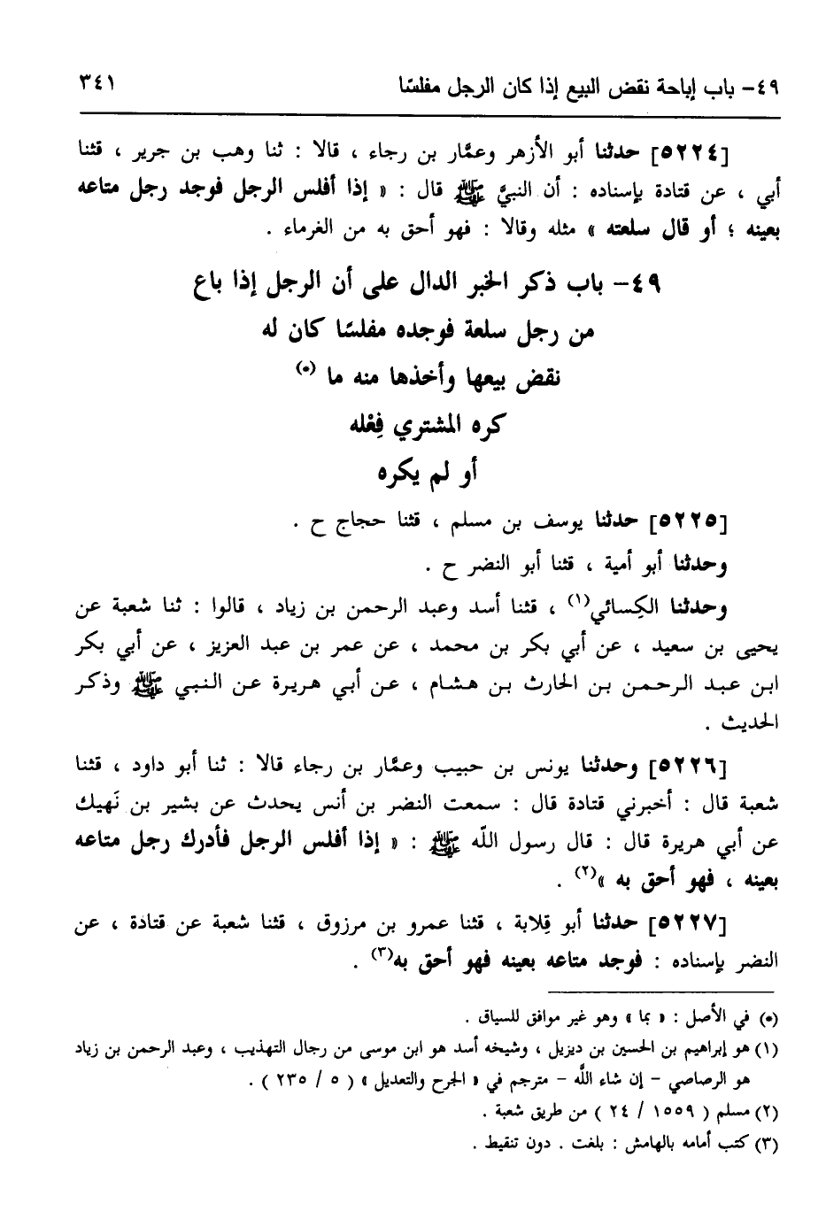 5227 - حَدَّثَنَا أَبُو قِلَابَةَ، قثنا عَمْرُو بْنُ مَرْزُوقٍ، قثنا شُعْبَةُ، عَنْ قَتَادَةَ، عَنِ النَّضْرِ، بِإِسْنَادِهِ «فَوَجَدَ مَتَاعَهُ بِعَيْنِهِ فَهُوَ أَحَقُّ بِهِ»
