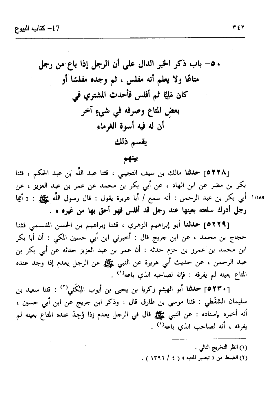 5228 - حَدَّثَنَا مَالِكُ بْنُ سَيْفٍ التُّجِيبِيُّ، قثنا عَبْدُ اللَّهِ بْنُ عَبْدِ الْحَكَمِ، قثنا بَكْرُ بْنُ مُضَرَ، عَنِ ابْنِ الْهَادِ، عَنْ أَبِي بَكْرِ بْنِ مُحَمَّدٍ، عَنْ عُمَرَ بْنِ عَبْدِ الْعَزِيزِ، عَنْ أَبِي بَكْرِ بْنِ عَبْدِ الرَّحْمَنِ، أَنَّهُ سَمِعَ أَبَا هُرَيْرَةَ، يَقُولُ قَالَ رَسُولُ اللَّهِ صَلَّى اللهُ عَلَيْهِ وَسَلَّمَ: «§أَيُّمَا رَجُلٍ أَدْرَكَ سِلْعَتَهُ بِعَيْنِهَا عِنْدَ رَجُلٍ قَدْ أَفْلَسَ، فَهُوَ أَحَقُّ بِهَا مِنْ غَيْرِهِ»