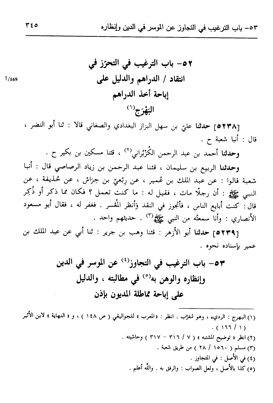 5238 - حَدَّثَنَا عَلِيُّ بْنُ سَهْلٍ الْبَزَّازُ الْبَغْدَادِيُّ، وَالصَّغَانِيُّ، قَالَا ثَنَا أَبُو النَّضْرِ، قَالَ أنبا شُعْبَةُ، ح وَحَدَّثَنَا أَحْمَدُ بْنُ عَبْدِ الرَّحْمَنِ الْكُزْبُرَانِيُّ، قثنا مِسْكِينُ بْنُ بُكَيْرٍ، ح وَحَدَّثَنَا الرَّبِيعُ بْنُ سُلَيْمَانَ، قثنا عَبْدُ الرَّحْمَنِ بْنُ زِيَادٍ الرَّصَاصِيُّ، قَالَ: أنبا شُعْبَةُ، قَالُوا عَنْ عَبْدِ الْمَلِكِ بْنِ عُمَيْرٍ، عَنْ رِبْعِيِّ بْنِ حِرَاشٍ، عَنْ حُذَيْفَةَ، عَنِ النَّبِيِّ صَلَّى اللهُ عَلَيْهِ وَسَلَّمَ " أَنَّ §رَجُلًا مَاتَ فَقِيلَ لَهُ: مَا كُنْتَ تَعْمَلُ؟ فَكَانَ مِمَّا ذَكَرَ أَوْ ذَكَرَ قَالَ: كُنْتُ أُبَايِعُ النَّاسَ، فَأَتَجَوَّزُ فِي النَّقْدِ، وَأَنْظُرُ الْمُعْسِرَ، فَغُفِرَ لَهُ "، فَقَالَ أَبُو مَسْعُودٍ الْأَنْصَارِيُّ: وَأَنَا سَمِعْتُهُ مِنَ النَّبِيِّ صَلَّى اللهُ عَلَيْهِ وَسَلَّمَ حَدِيثُهُمْ وَاحِدٌ،