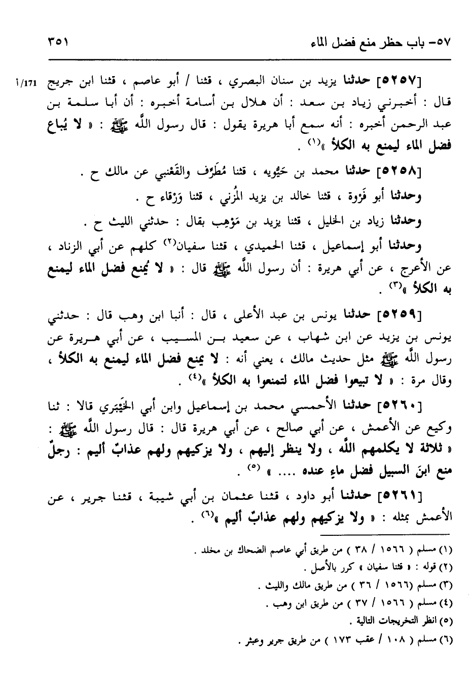 5258 - حَدَّثَنَا مُحَمَّدُ بْنُ حَيَّوَيْهِ، قثنا مُطَرِّفٌ، وَالْقَعْنَبِيُّ، عَنْ مَالِكٍ، ح وَحَدَّثَنَا أَبُو فَرْوَةَ، قثنا خَالِدُ بْنُ يَزِيدَ الْمُزَنِيُّ، قثنا وَرْقَاءُ، ح وَحَدَّثَنَا زِيَادُ بْنُ الْخَلِيلِ، قثنا يَزِيدُ بْنُ مَوْهَبٍ، بَقَّالٌ، حَدَّثَنِي اللَّيْثُ، ح وَحَدَّثَنَا أَبُو إِسْمَاعِيلَ، قثنا الْحُمَيْدِيُّ، قثنا سُفْيَانُ، كُلُّهُمْ عَنْ أَبِي الزِّنَادِ، عَنِ الْأَعْرَجِ، عَنْ أَبِي هُرَيْرَةَ، أَنَّ رَسُولَ اللَّهِ صَلَّى اللهُ عَلَيْهِ وَسَلَّمَ قَالَ: «§لَا يُمْنَعْ فَضْلُ الْمَاءِ لِيُمْنَعَ بِهِ الْكَلَأُ»