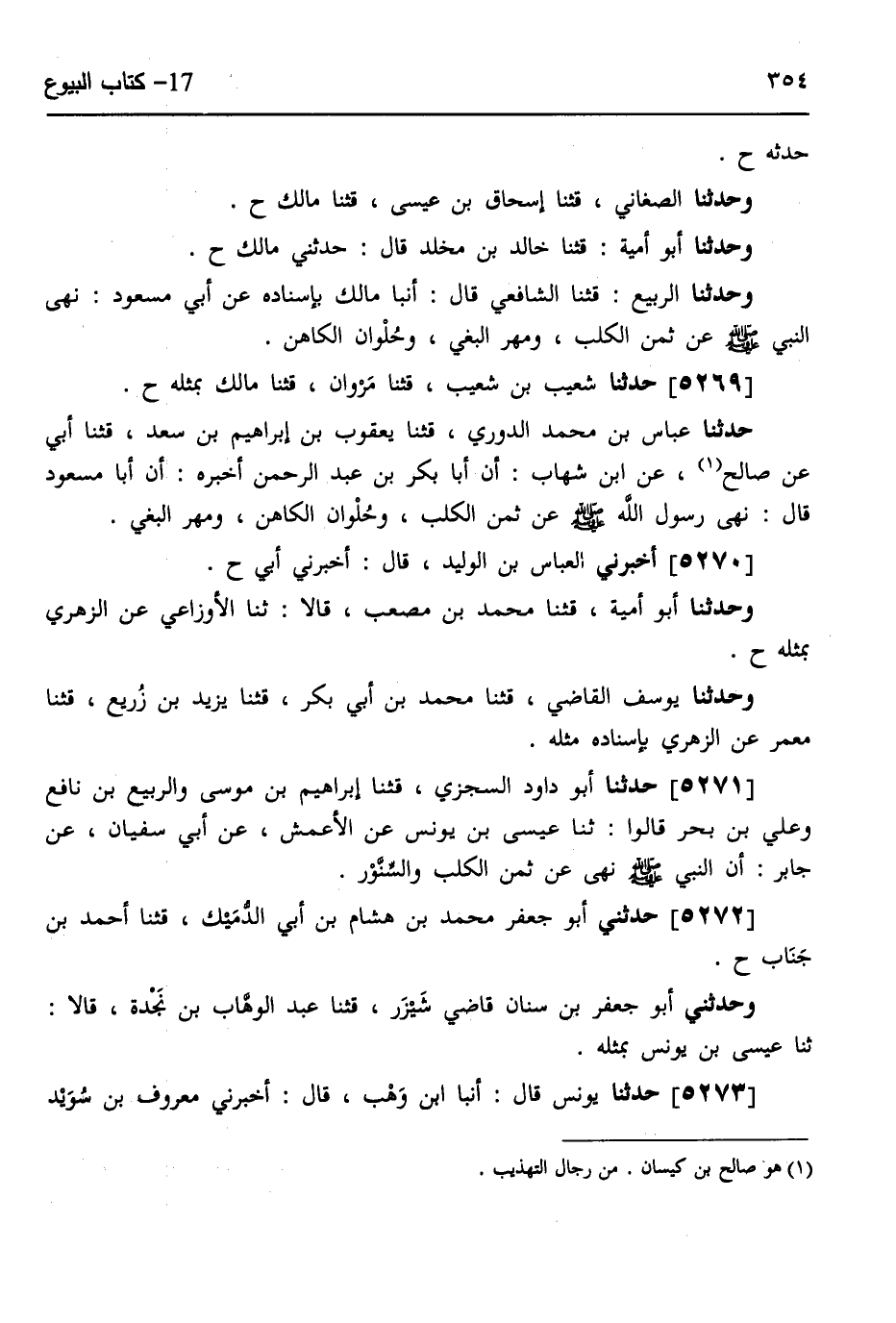 5269 - حَدَّثَنَا شُعَيْبُ بْنُ شُعَيْبٍ، قثنا مَرْوَانُ، قثنا مَالِكٌ، بِمِثْلِهِ ح حَدَّثَنَا عَبَّاسُ بْنُ مُحَمَّدٍ الدُّورِيُّ، قثنا يَعْقُوبُ بْنُ إِبْرَاهِيمَ بْنِ سَعْدٍ، قثنا أَبِي، عَنْ صَالِحٍ، عَنِ ابْنِ شِهَابٍ، أَنَّ أَبَا بَكْرِ بْنَ عَبْدِ الرَّحْمَنِ، أَخْبَرَهُ أَنَّ أَبَا مَسْعُودٍ قَالَ: «§نَهَى رَسُولُ اللَّهِ صَلَّى اللهُ عَلَيْهِ وَسَلَّمَ عَنْ ثَمَنِ الْكَلْبِ، وَحُلْوَانِ الْكَاهِنِ، وَمَهْرِ الْبَغِيِّ» ،