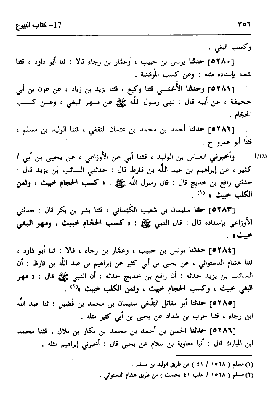 5283 - حثنا سُلَيْمَانُ بْنُ شُعَيْبٍ الْكَيْسَانِيُّ، قثنا بِشْرُ بْنُ بَكْرٍ، قَالَ: حَدَّثَنِي الْأَوْزَاعِيُّ، بِإِسْنَادِهِ قَالَ: قَالَ النَّبِيُّ صَلَّى اللهُ عَلَيْهِ وَسَلَّمَ: «§كَسْبُ الْحَجَّامِ خَبِيثٌ، وَمَهْرُ الْبَغِيِّ خَبِيثٌ»