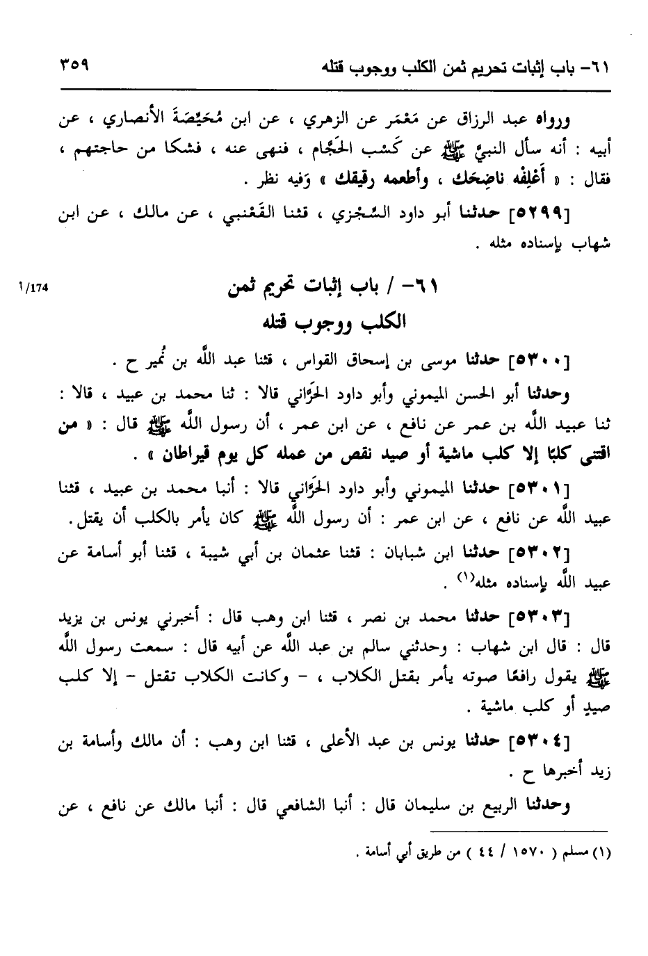 5303 - حَدَّثَنَا مُحَمَّدُ بْنُ نَصْرٍ، قثنا ابْنُ وَهْبٍ، قَالَ: أَخْبَرَنِي يُونُسُ بْنُ يَزِيدَ، قَالَ: قَالَ ابْنُ شِهَابٍ: وَحَدَّثَنِي سَالِمُ بْنُ عَبْدِ اللَّهِ، عَنْ أَبِيهِ، قَالَ: سَمِعْتُ رَسُولَ اللَّهِ صَلَّى اللهُ عَلَيْهِ وَسَلَّمَ يَقُولُ رَافِعًا صَوْتَهُ «§يَأْمُرُ بِقَتْلِ الْكِلَابِ، وَكَانَتِ الْكِلَابُ تُقْتَلُ، إِلَّا كَلْبَ صَيْدٍ، أَوْ كَلْبَ مَاشِيَةٍ»