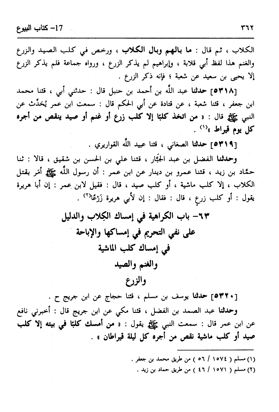 5320 - حَدَّثَنَا يُوسُفُ بْنُ مُسْلِمٍ، قثنا حَجَّاجٌ، عَنِ ابْنِ جُرَيْجٍ، ح وَحَدَّثَنَا عَبْدُ الصَّمَدِ بْنُ الْفَضْلِ، قثنا مَكِّيٌّ، عَنِ ابْنِ جُرَيْجٍ، قَالَ: أَخْبَرَنِي نَافِعٌ، عَنِ ابْنِ عُمَرَ، قَالَ: سَمِعْتُ النَّبِيَّ صَلَّى اللهُ عَلَيْهِ وَسَلَّمَ يَقُولُ: «§مَنْ أَمْسَكَ كَلْبًا فِي بَيْتِهِ، إِلَّا كَلْبَ صَيْدٍ، أَوْ كَلْبَ مَاشِيَةٍ، نَقَصَ مِنْ أَجْرِهِ كُلَّ لَيْلَةٍ قِيرَاطَانِ» -[363]- وَزَعَمَ أَبُو هُرَيْرَةَ وَهُوَ صَاحِبُ حَرْثٍ أَنَّ النَّبِيَّ صَلَّى اللهُ عَلَيْهِ وَسَلَّمَ قَالَ: «وَكَلْبُ حَرْثٍ»