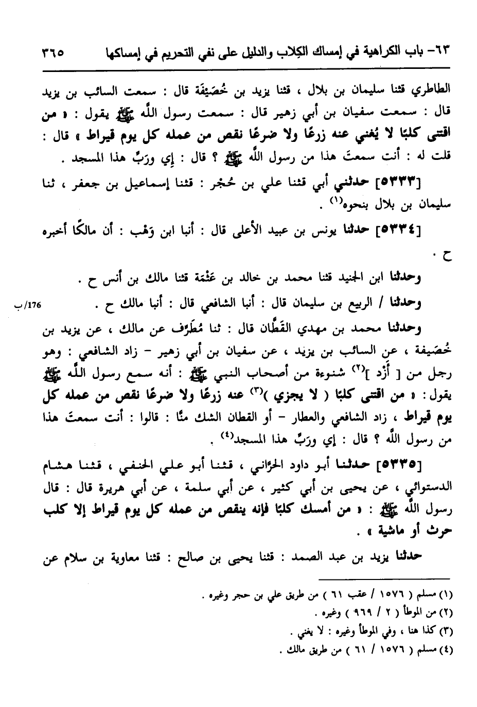 5335 - حَدَّثَنَا أَبُو دَاوُدَ الْحَرَّانِيُّ، قثنا أَبُو عَلِيٍّ الْحَنَفِيُّ، قثنا هِشَامٌ الدَّسْتُوَائِيُّ، عَنْ يَحْيَى بْنِ أَبِي كَثِيرٍ، عَنْ أَبِي سَلَمَةَ، عَنْ أَبِي هُرَيْرَةَ، قَالَ: قَالَ رَسُولُ اللَّهِ صَلَّى اللهُ عَلَيْهِ وَسَلَّمَ: «§مَنْ أَمْسَكَ كَلْبًا، فَإِنَّهُ يَنْقُصُ مِنْ عَمَلِهِ كُلَّ يَوْمٍ قِيرَاطٌ إِلَّا كَلْبَ حَرْثٍ، أَوْ مَاشِيَةٍ» حَدَّثَنَا يَزِيدُ بْنُ عَبْدِ الصَّمَدِ، قثنا يَحْيَى بْنُ صَالِحٍ، قثنا مُعَاوِيَةُ بْنُ سَلَّامٍ، عَنْ -[366]- يَحْيَى، عَنْ أَبِي سَلَمَةَ، عَنْ أَبِي هُرَيْرَةَ، عَنِ النَّبِيِّ صَلَّى اللهُ عَلَيْهِ وَسَلَّمَ بِمِثْلِهِ