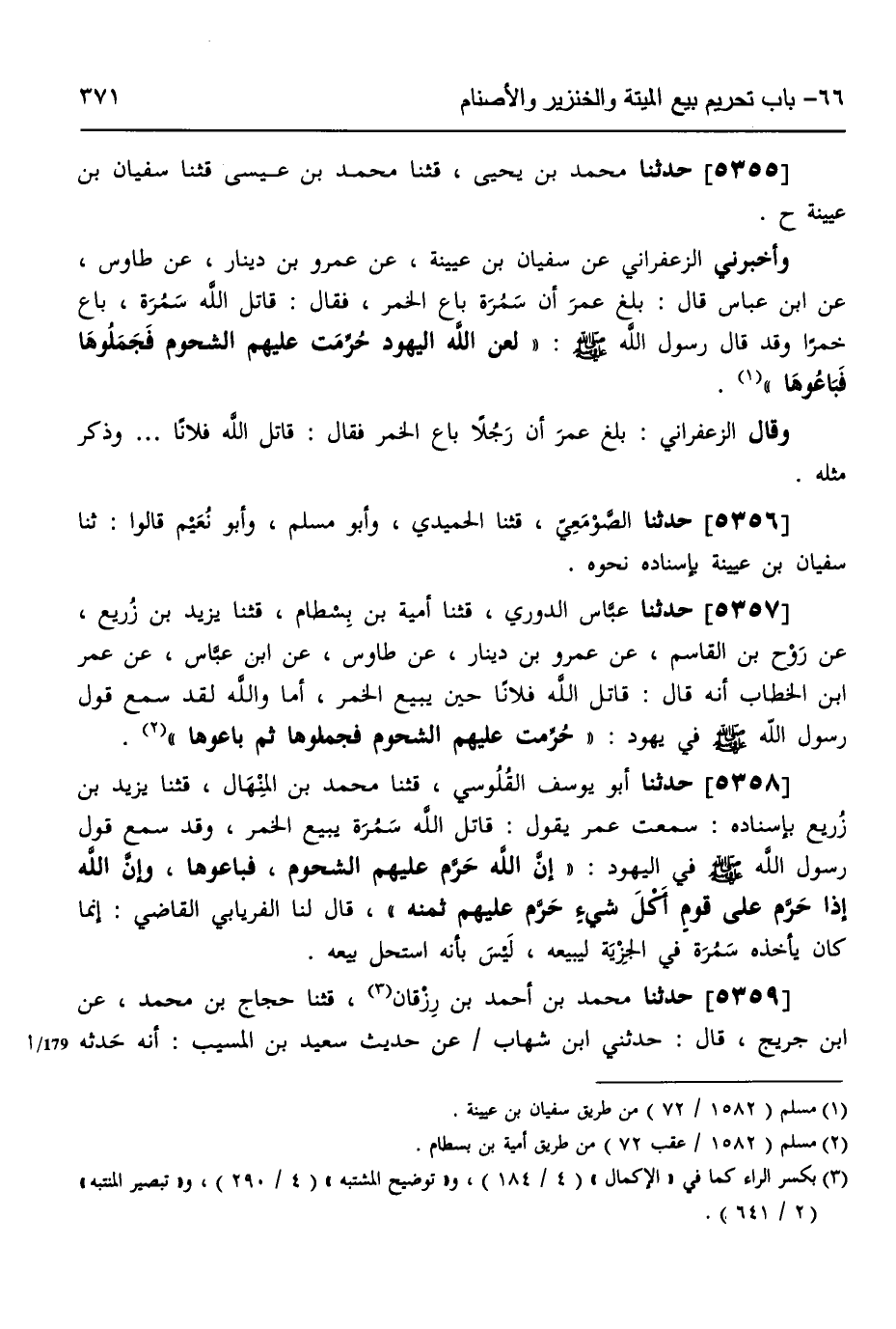 5355 - حَدَّثَنَا مُحَمَّدُ بْنُ يَحْيَى، قثنا مُحَمَّدُ بْنُ عِيسَى، قثنا سُفْيَانُ بْنُ عُيَيْنَةَ، ح وَأَخْبَرَنِي الزَّعْفَرَانِيُّ، عَنْ سُفْيَانَ بْنِ عُيَيْنَةَ، عَنْ عَمْرِو بْنِ دِينَارٍ، عَنْ طَاوُسٍ، عَنِ ابْنِ عَبَّاسٍ، قَالَ: بَلَغَ عُمَرَ أَنَّ سَمُرَةَ، بَاعَ الْخَمْرَ، فَقَالَ: قَاتَلَ اللَّهُ سَمُرَةَ بَاعَ خَمْرًا، وَقَدْ قَالَ رَسُولُ اللَّهِ صَلَّى اللهُ عَلَيْهِ وَسَلَّمَ: «§لَعَنَ اللَّهُ الْيَهُودَ حُرِّمَتْ عَلَيْهِمُ الشُّحُومُ، فَجَمَلُوهَا، فَبَاعُوهَا» وَقَالَ الزَّعْفَرَانِيُّ: بَلَغَ عُمَرَ أَنَّ رَجُلًا بَاعَ الْخَمْرَ، فَقَالَ: قَاتَلَ اللَّهُ فُلَانًا وَذَكَرَ مِثْلَهُ،