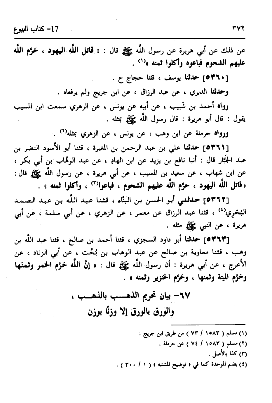 5361 - حَدَّثَنَا عَلِيُّ بْنُ عَبْدِ الرَّحْمَنِ بْنِ الْمُغِيرَةِ، قثنا أَبُو الْأَسْوَدِ النَّضْرُ بْنُ عَبْدِ الْجَبَّارِ، قَالَ: أنبا نَافِعُ بْنُ يَزِيدَ، عَنِ ابْنِ الْهَادِ، عَنْ عَبْدِ الْوَهَّابِ بْنِ أَبِي بَكْرٍ، عَنِ ابْنِ شِهَابٍ، عَنْ سَعِيدِ بْنِ الْمُسَيِّبِ، عَنْ أَبِي هُرَيْرَةَ، عَنْ رَسُولِ اللَّهِ صَلَّى اللهُ عَلَيْهِ وَسَلَّمَ قَالَ: «§قَاتَلَ اللَّهُ الْيَهُودَ حَرَّمَ اللَّهُ عَلَيْهِمُ الشُّحُومَ، فَبَاعُوا وَأَكَلُوا ثَمَنَهُ» ،