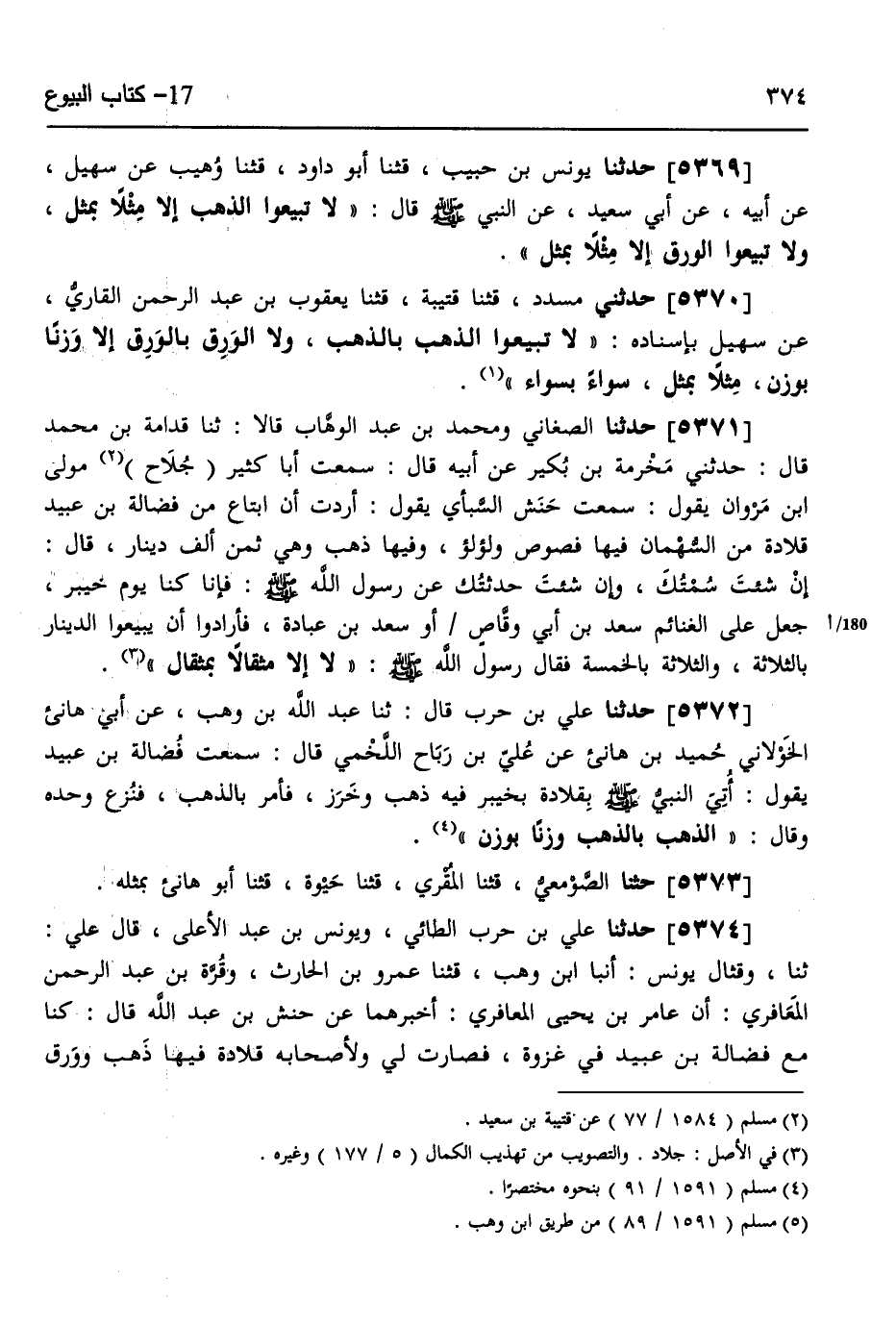 5370 - حَدَّثَنِي مُسَدَّدٌ، قثنا قُتَيْبَةُ، قثنا يَعْقُوبُ بْنُ عَبْدِ الرَّحْمَنِ الْقَارِيُّ، عَنْ سُهَيْلٍ، بِإِسْنَادِهِ «§لَا تَبِيعُوا الذَّهَبَ بِالذَّهَبِ، وَلَا الْوَرِقَ بِالْوَرِقِ إِلَّا وَزْنًا بِوَزْنٍ مِثْلًا بِمِثْلٍ سَوَاءً بِسَوَاءٍ»