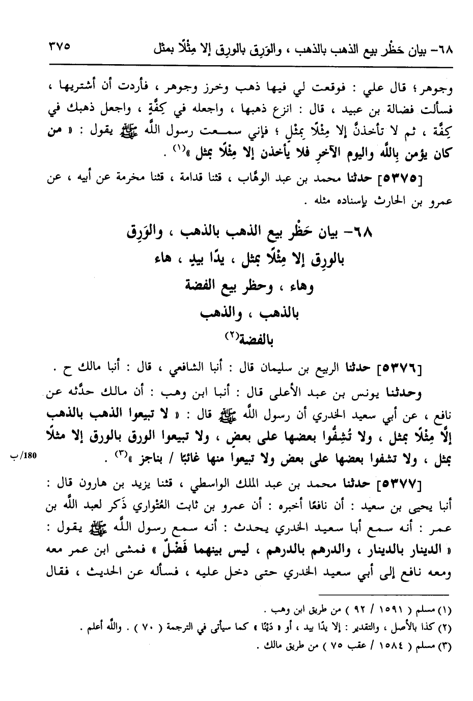 5376 - حَدَّثَنَا الرَّبِيعُ بْنُ سُلَيْمَانَ، قَالَ: أنبا الشَّافِعِيُّ، قَالَ: أنبا مَالِكٌ، ح وَحَدَّثَنَا يُونُسُ بْنُ عَبْدِ الْأَعْلَى، قَالَ: أنبا ابْنُ وَهْبٍ، أَنَّ مَالِكًا، حَدَّثَهُ عَنْ نَافِعٍ، عَنْ أَبِي سَعِيدٍ الْخُدْرِيِّ، أَنَّ رَسُولَ اللَّهِ صَلَّى اللهُ عَلَيْهِ وَسَلَّمَ قَالَ: «§لَا تَبِيعُوا الذَّهَبَ بِالذَّهَبِ إِلَّا مِثْلًا بِمِثْلٍ، وَلَا تُشِفُّوا بَعْضُهَا عَلَى بَعْضٍ، وَلَا تَبِيعُوا الْوَرِقَ بِالْوَرِقِ إِلَّا مِثْلًا بِمِثْلٍ، وَلَا تُشِفُّوا بَعْضُهَا عَلَى بَعْضٍ، وَلَا تَبِيعُوا مِنْهَا غَائِبًا بِنَاجِزٍ»