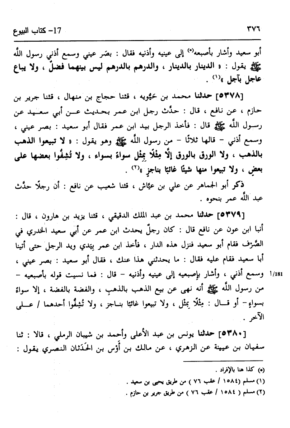 5378 - حَدَّثَنَا مُحَمَّدُ بْنُ حَيَّوَيْهِ، قثنا حَجَّاجُ بْنُ مِنْهَالٍ، قثنا جَرِيرُ بْنُ حَازِمٍ، عَنْ نَافِعٍ، قَالَ: حَدَّثَ رَجُلٌ ابْنَ عُمَرَ بِحَدِيثٍ عَنْ أَبِي سَعِيدٍ، عَنْ رَسُولِ اللَّهِ صَلَّى اللهُ عَلَيْهِ وَسَلَّمَ قَالَ: فَأَخَذَ الرَّجُلُ بِيَدِ ابْنِ عُمَرَ فَقَالَ أَبُو سَعِيدٍ: بَصُرَ عَيْنِي وَسَمِعَ أُذُنِي قَالَهَا ثَلَاثًا مِنْ رَسُولِ اللَّهِ صَلَّى اللهُ عَلَيْهِ وَسَلَّمَ وَهُوَ يَقُولُ: «§لَا تَبِيعُوا الذَّهَبَ بِالذَّهَبِ، وَلَا الْوَرِقَ بِالْوَرِقِ، إِلَّا مِثْلًا بِمِثْلٍ سَوَاءً بِسَوَاءٍ، وَلَا تُشِفُّوا بَعْضُهَا عَلَى بَعْضٍ، وَلَا تَبِيعُوا مِنْهَا شَيْئًا غَائِبًا بِنَاجِزٍ» ذَكَرَ أَبُو الْجُمَاهِرِ، عَنْ عَلِيِّ بْنِ عَيَّاشٍ، قثنا شُعَيْبٌ، عَنْ نَافِعٍ أَنَّ رَجُلًا حَدَّثَ عَبْدَ اللَّهِ بْنَ عُمَرَ بِنَحْوِهِ