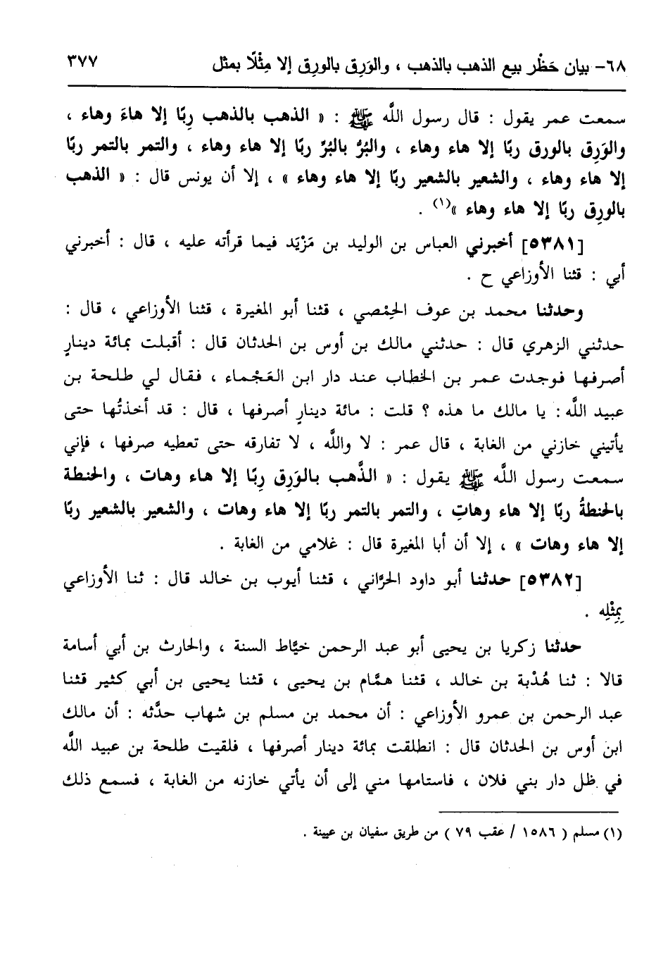 5381 - أَخْبَرَنِي الْعَبَّاسُ بْنُ الْوَلِيدِ بْنِ مَزْيَدٍ، فِيمَا قَرَأْتُهُ عَلَيْهِ، قَالَ: أَخْبَرَنِي أَبِي، قثنا الْأَوْزَاعِيُّ، ح وَحَدَّثَنَا مُحَمَّدُ بْنُ عَوْفٍ الْحِمْصِيُّ، قثنا أَبُو الْمُغِيرَةِ، قثنا الْأَوْزَاعِيُّ، قَالَ: حَدَّثَنِي الزُّهْرِيُّ، قَالَ: حَدَّثَنِي مَالِكُ بْنُ أَوْسِ بْنِ الْحَدَثَانِ، قَالَ: أَقْبَلْتُ بِمِائَةِ دِينَارٍ أَصْرِفُهَا، فَوَجَدْتُ عُمَرَ بْنَ الْخَطَّابِ عِنْدَ دَارِ ابْنِ الْعَجْمَاءِ فَقَالَ لِي طَلْحَةُ بْنُ عُبَيْدِ اللَّهِ: يَا مَالِكُ، مَا هَذِهِ؟ قُلْتُ: مِائَةُ دِينَارٍ أَصْرِفُهَا قَالَ: قَدْ أَخَذْتُهَا حَتَّى يَأْتِيَنِي خَازِنِي مِنَ الْغَابَةِ قَالَ عُمَرُ: لَا وَاللَّهِ لَا تُفَارِقُهُ حَتَّى تُعْطِيَهُ صَرْفَهَا فَإِنِّي سَمِعْتُ رَسُولَ اللَّهِ صَلَّى اللهُ عَلَيْهِ وَسَلَّمَ يَقُولُ: «§الذَّهَبُ بِالْوَرِقِ رِبًا إِلَّا هَاءَ وَهَاتِ، وَالْحِنْطَةُ بِالْحِنْطَةِ رِبًا إِلَّا هَاءَ وَهَاتِ، وَالتَّمْرُ بِالتَّمْرِ رِبًا إِلَّا هَاءَ وَهَاتِ، وَالشَّعِيرُ بِالشَّعِيرِ رِبًا إِلَّا هَاءَ وَهَاتِ» ، إِلَّا أَنَّ أَبَا الْمُغِيرَةِ قَالَ: غُلَامِي مِنَ الْغَابَةِ