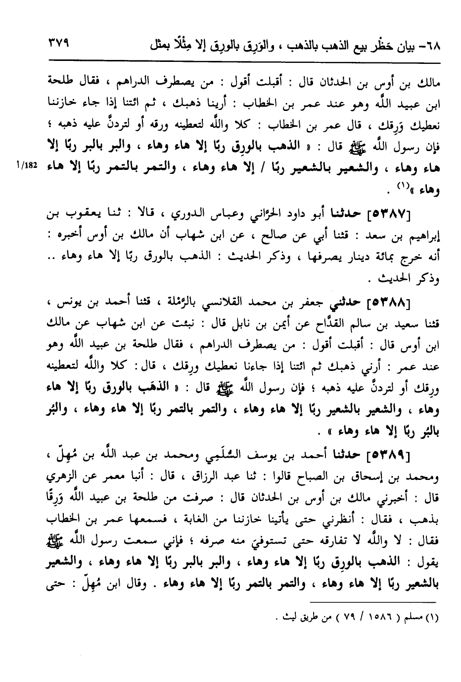 5389 - حَدَّثَنَا أَحْمَدُ بْنُ يُوسُفَ السُّلَمِيُّ، وَمُحَمَّدُ بْنُ عَبْدِ اللَّهِ بْنِ مُهِلٍّ، وَمُحَمَّدُ بْنُ إِسْحَاقَ بْنِ الصَّبَّاحِ، قَالُوا: ثَنَا عَبْدُ الرَّزَّاقِ، قَالَ: أنبا مَعْمَرٌ، عَنِ الزُّهْرِيِّ، قَالَ: أَخْبَرَنِي مَالِكُ بْنُ أَوْسِ بْنِ الْحَدَثَانِ، قَالَ: صَرَفْتُ مِنْ طَلْحَةَ بْنِ عُبَيْدِ اللَّهِ وَرِقًا بِذَهَبٍ، فَقَالَ: أَنْظِرْنِي حَتَّى يَأْتِيَنَا خَازِنُنَا مِنَ الْغَابَةِ، فَسَمِعَهَا عُمَرُ بْنُ الْخَطَّابِ، فَقَالَ: لَا وَاللَّهِ لَا تُفَارِقُهُ حَتَّى تَسْتَوْفِيَ مِنْهُ صَرْفَهُ، فَإِنِّي سَمِعْتُ رَسُولَ اللَّهِ صَلَّى اللهُ عَلَيْهِ وَسَلَّمَ يَقُولُ: «§الذَّهَبُ بِالْوَرِقِ رِبًا إِلَّا هَاءَ وَهَاءَ، وَالْبُرُّ بِالْبُرِّ رِبًا إِلَّا هَاءَ وَهَاءَ، وَالشَّعِيرُ بِالشَّعِيرِ رِبًا إِلَّا هَاءَ وَهَاءَ، وَالتَّمْرُ بِالتَّمْرِ رِبًا إِلَّا هَاءَ وَهَاءَ» وَقَالَ ابْنُ مُهِلٍّ: حَتَّى -[380]- يَسْتَوْفِيَ مِنْكَ صَرْفَكَ