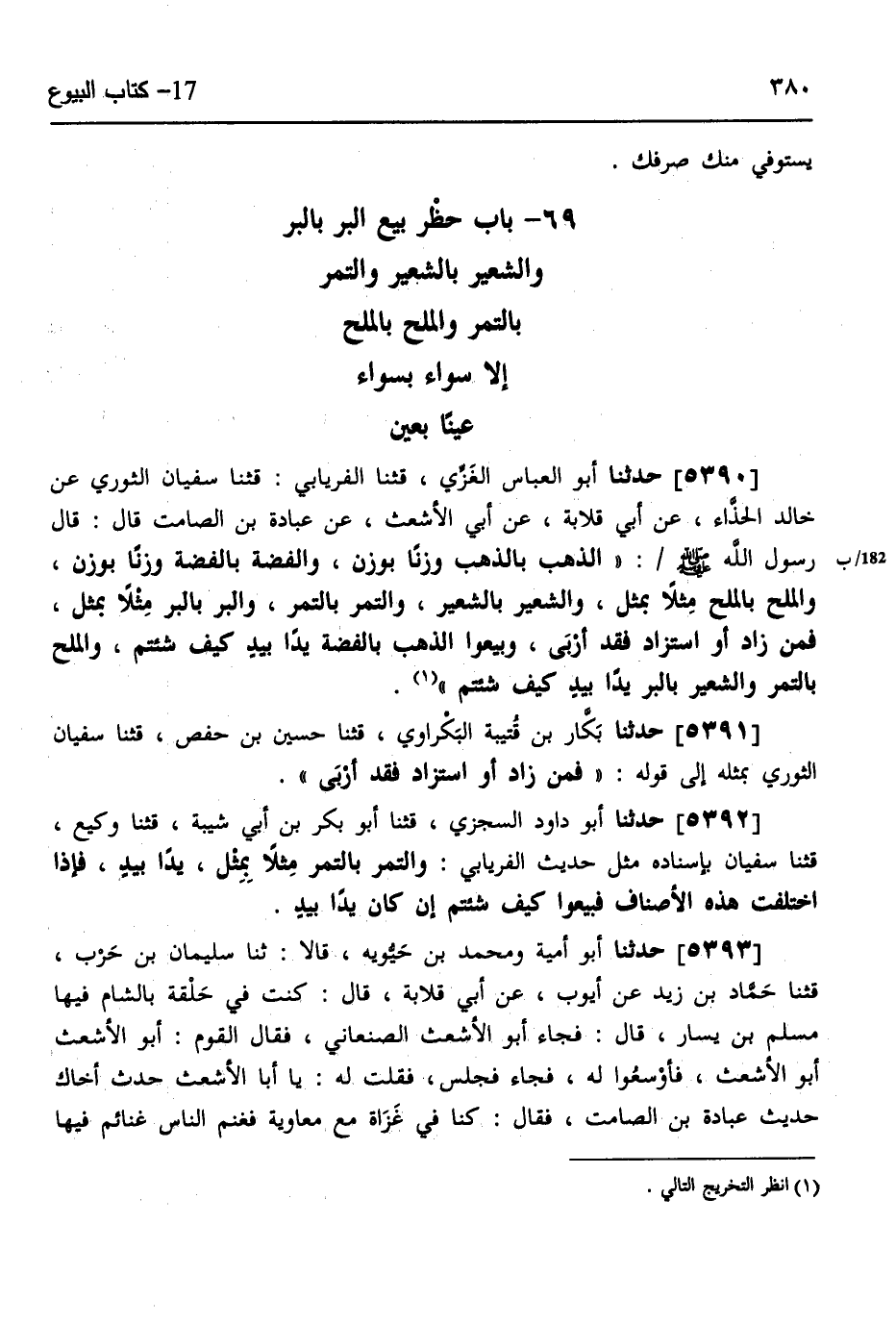 5390 - حَدَّثَنَا أَبُو الْعَبَّاسِ الْغَزِّيُّ، قثنا الْفِرْيَابِيُّ، قثنا سُفْيَانُ الثَّوْرِيُّ، عَنْ خَالِدٍ الْحَذَّاءِ، عَنْ أَبِي قِلَابَةَ، عَنْ أَبِي الْأَشْعَثِ، عَنْ عُبَادَةَ بْنِ الصَّامِتِ، قَالَ: قَالَ رَسُولُ اللَّهِ صَلَّى اللهُ عَلَيْهِ وَسَلَّمَ: «§الذَّهَبُ بِالذَّهَبِ وَزْنًا بِوَزْنٍ، وَالْفِضَّةُ بِالْفِضَّةِ وَزْنًا بِوَزْنٍ، وَالْمِلْحُ بِالْمِلْحِ مِثْلًا بِمِثْلٍ، وَالشَّعِيرُ بِالشَّعِيرِ، وَالتَّمْرُ بِالتَّمْرِ، وَالْبُرُّ بِالْبُرِّ مِثْلًا بِمِثْلٍ، فَمَنْ زَادَ أَوِ اسْتَزَادَ، فَقَدْ أَرْبَى، وَبِيعُوا الذَّهَبَ بِالْفِضَّةِ يَدًا بِيَدٍ كَيْفَ شِئْتُمْ، وَالْمِلْحَ بِالتَّمْرِ وَالشَّعِيرَ بِالْبُرِّ يَدًا بِيَدٍ كَيْفَ شِئْتُمْ» ،