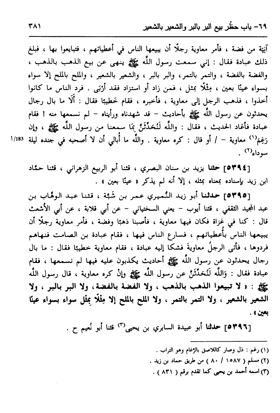 5395 - حَدَّثَنَا أَبُو زَيْدٍ النُّمَيْرِيُّ، عُمَرُ بْنُ شَبَّةَ، قثنا عَبْدُ الْوَهَّابِ بْنُ عَبْدِ الْمَجِيدِ الثَّقَفِيُّ، قثنا أَيُّوبُ يَعْنِي السَّخْتِيَانِيَّ، عَنْ أَبِي قِلَابَةَ، عَنْ أَبِي الْأَشْعَثِ، قَالَ: كُنَّا فِي غَزَاةٍ فَكَانَ فِيهَا مُعَاوِيَةُ، فَأَصَبْنَا ذَهَبًا وَفِضَّةً، فَأَمَرَ مُعَاوِيَةُ رَجُلًا أَنْ يَبِيعَهَا النَّاسَ بِأُعْطِيَاتِهِمْ، فَسَارَعَ النَّاسُ، فِيهَا فَقَامَ عُبَادَةُ بْنُ الصَّامِتِ، فَنَهَاهُمْ فَرَدُّوهَا، فَأَتَى الرَّجُلُ مُعَاوِيَةَ فَشَكَا إِلَيْهِ عُبَادَةَ، فَقَامَ مُعَاوِيَةُ خَطِيبا، فَقَالَ: مَا بَالُ رِجَالٍ يُحَدِّثُونَ عَنْ رَسُولِ اللَّهِ صَلَّى اللهُ عَلَيْهِ وَسَلَّمَ أَحَادِيثَ يَكْذِبُونَ عَلَيْهِ فِيهَا لَمْ نَسْمَعْهَا؟ فَقَامَ عُبَادَةُ: فَقَالَ: وَاللَّهِ لَنُحَدِّثَنَّ عَنْ رَسُولِ اللَّهِ صَلَّى اللهُ عَلَيْهِ وَسَلَّمَ وَإِنْ كَرِهَ مُعَاوِيَةُ، قَالَ رَسُولُ اللَّهِ صَلَّى اللهُ عَلَيْهِ وَسَلَّمَ: «§لَا تَبِيعُوا الذَّهَبَ بِالذَّهَبِ، وَلَا الْفِضَّةَ بِالْفِضَّةِ، وَلَا الْبُرَّ بِالْبُرِّ، وَلَا الشَّعِيرَ بِالشَّعِيرِ، وَلَا التَّمْرَ بِالتَّمْرِ، وَلَا الْمِلْحَ بِالْمِلْحِ، إِلَّا مِثْلًا بِمِثْلٍ سَوَاءً بِسَوَاءٍ عَيْنا بِعَيْنٍ»