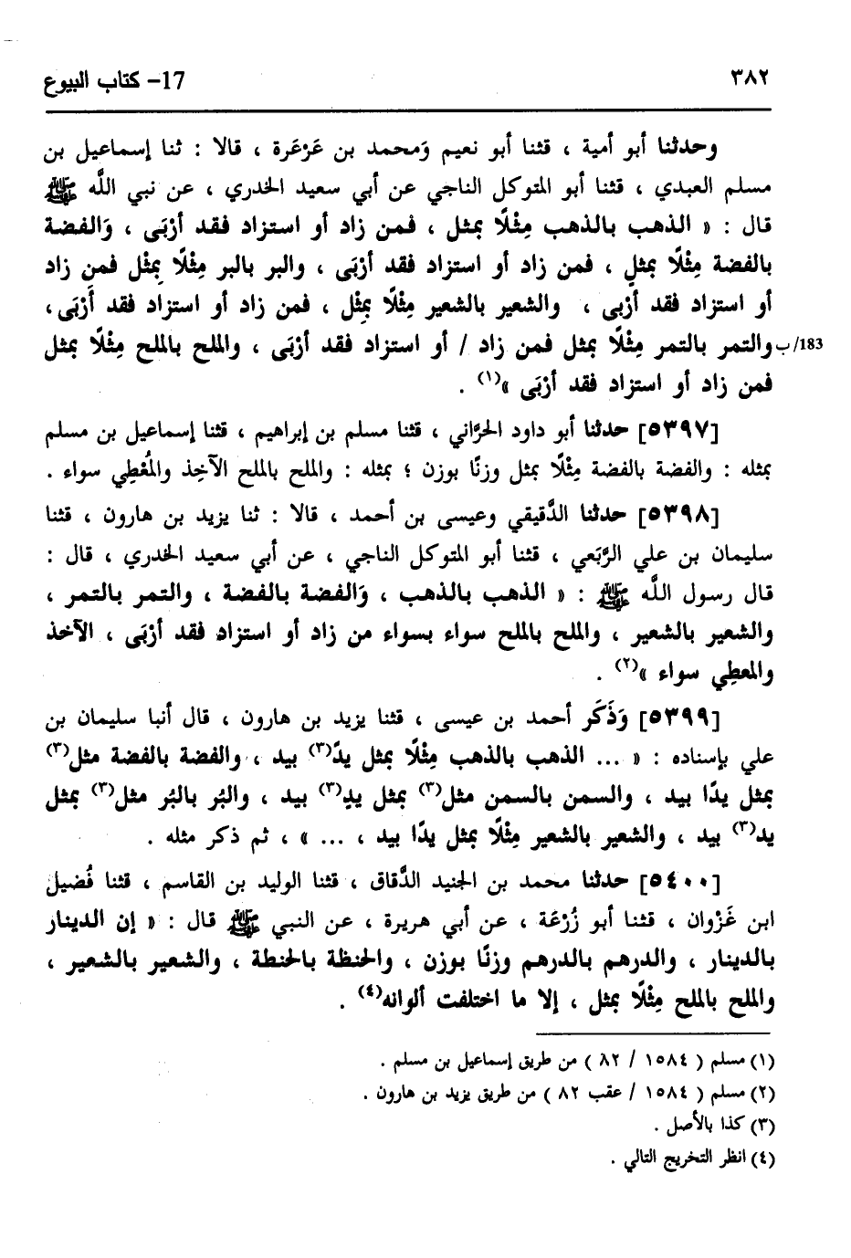 5398 - حَدَّثَنَا الدَّقِيقِيُّ، وَعِيسَى بْنُ أَحْمَدَ، قَالَا: ثَنَا يَزِيدُ بْنُ هَارُونَ، قثنا سُلَيْمَانُ بْنُ عَلِيٍّ الرَّبَعِيُّ، قثنا أَبُو الْمُتَوَكِّلِ النَّاجِيُّ، عَنْ أَبِي سَعِيدٍ الْخُدْرِيِّ، قَالَ: قَالَ رَسُولُ اللَّهِ صَلَّى اللهُ عَلَيْهِ وَسَلَّمَ: «§الذَّهَبُ بِالذَّهَبِ، وَالْفِضَّةُ بِالْفِضَّةِ، وَالتَّمْرُ بِالتَّمْرِ، وَالشَّعِيرُ بِالشَّعِيرِ، وَالْمِلْحُ بِالْمِلْحِ سَوَاءً بِسَوَاءٍ مِنْ زَادَ أَوِ اسْتَزَادَ، فَقَدْ أَرْبَى الْآخِذُ وَالْمُعْطِي سَوَاءٌ»