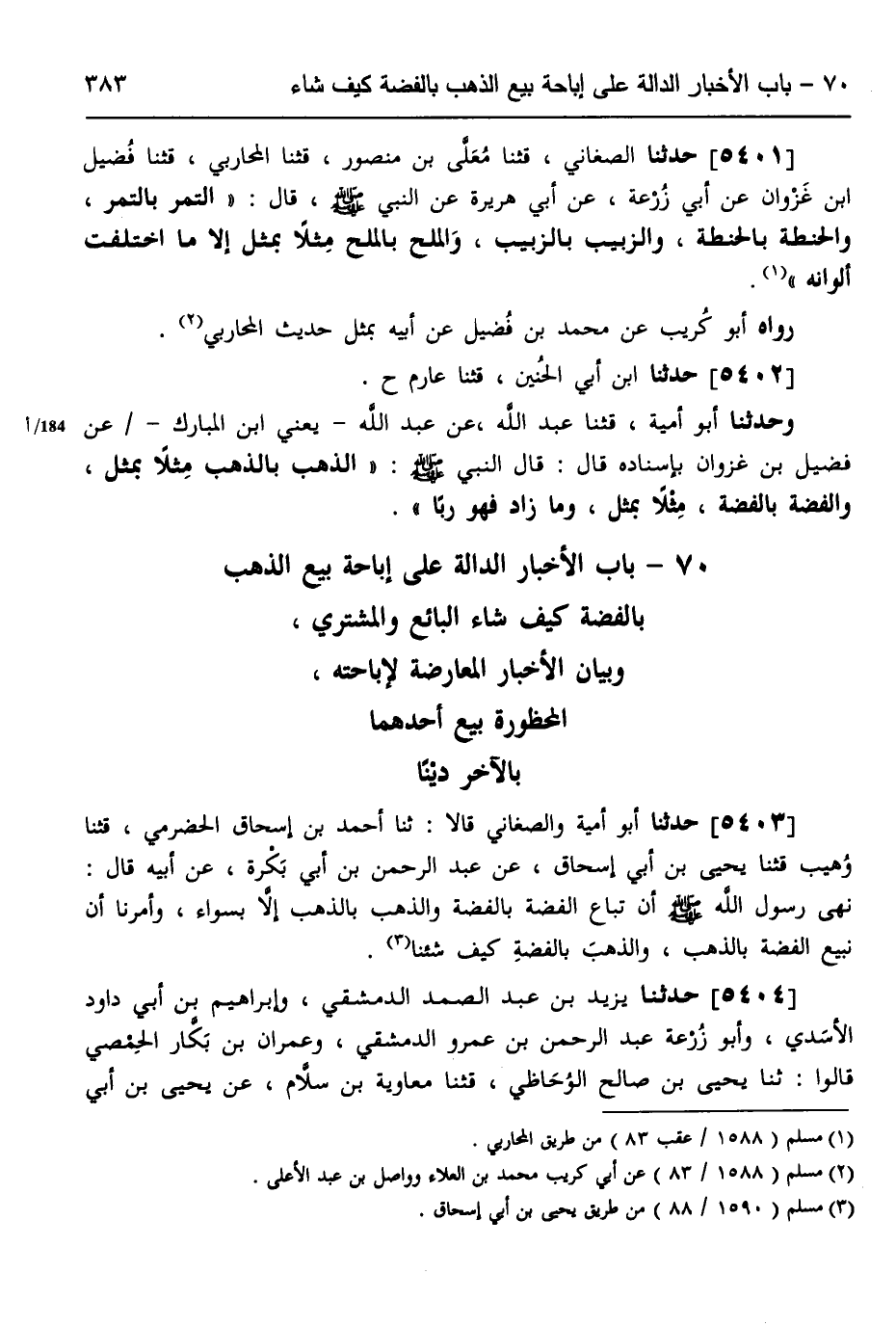 5404 - حَدَّثَنَا يَزِيدُ بْنُ عَبْدِ الصَّمَدِ الدِّمَشْقِيُّ، وَإِبْرَاهِيمُ بْنُ أَبِي دَاوُدَ الْأَسَدِيُّ، وَأَبُو زُرْعَةَ عَبْدُ الرَّحْمَنِ بْنُ عَمْرٍو الدِّمَشْقِيُّ، وَعِمْرَانُ بْنُ بَكَّارٍ الْحِمْصِيُّ قَالُوا: ثَنَا يَحْيَى بْنُ صَالِحٍ الْوُحَاظِيُّ، قثنا مُعَاوِيَةُ بْنُ سَلَّامٍ، عَنْ يَحْيَى بْنِ أَبِي -[384]- كَثِيرٍ، عَنْ يَحْيَى بْنِ أَبِي إِسْحَاقَ، أَنَّ عَبْدَ الرَّحْمَنِ بْنَ أَبِي بَكْرَةَ، أَخْبَرَهُ أَنَّ أَبَا بَكْرَةَ قَالَ: نَهَانَا رَسُولُ اللَّهِ صَلَّى اللهُ عَلَيْهِ وَسَلَّمَ أَنْ نَبِيعَ الْفِضَّةَ بِالْفِضَّةِ إِلَّا عَيْنا بِعَيْنٍ سَوَاءً بِسَوَاءٍ وَلَا نَبِيعَ الذَّهَبَ بِالذَّهَبِ إِلَّا عَيْنًا بِعَيْنٍ سَوَاءً بِسَوَاءٍ وَقَالَ رَسُولُ اللَّهِ صَلَّى اللهُ عَلَيْهِ وَسَلَّمَ: «§بِيعُوا الذَّهَبَ بِالْفِضَّةِ كَيْفَ شِئْتُمْ، وَالْفِضَّةَ بِالذَّهَبِ كَيْفَ شِئْتُمْ يَدًا بِيَدٍ»