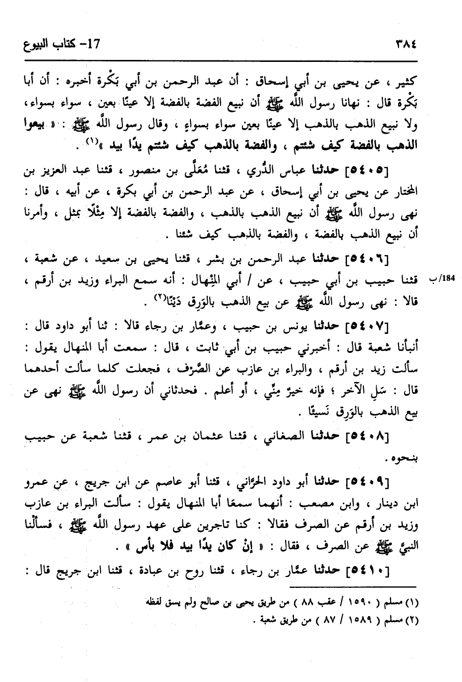 5406 - حَدَّثَنَا عَبْدُ الرَّحْمَنِ بْنُ بِشْرٍ، قثنا يَحْيَى بْنُ سَعِيدٍ، عَنْ شُعْبَةَ، قثنا حَبِيبُ بْنُ أَبِي حَبِيبٍ، عَنْ أَبِي الْمِنْهَالِ، أَنّهُ سَمِعَ الْبَرَاءَ، وَزَيْدَ بْنَ أَرْقَمَ، قَالَا: «§نَهَى رَسُولُ اللَّهِ صَلَّى اللهُ عَلَيْهِ وَسَلَّمَ عَنْ بَيْعِ الذَّهَبِ بِالْوَرِقِ دَيْنًا»