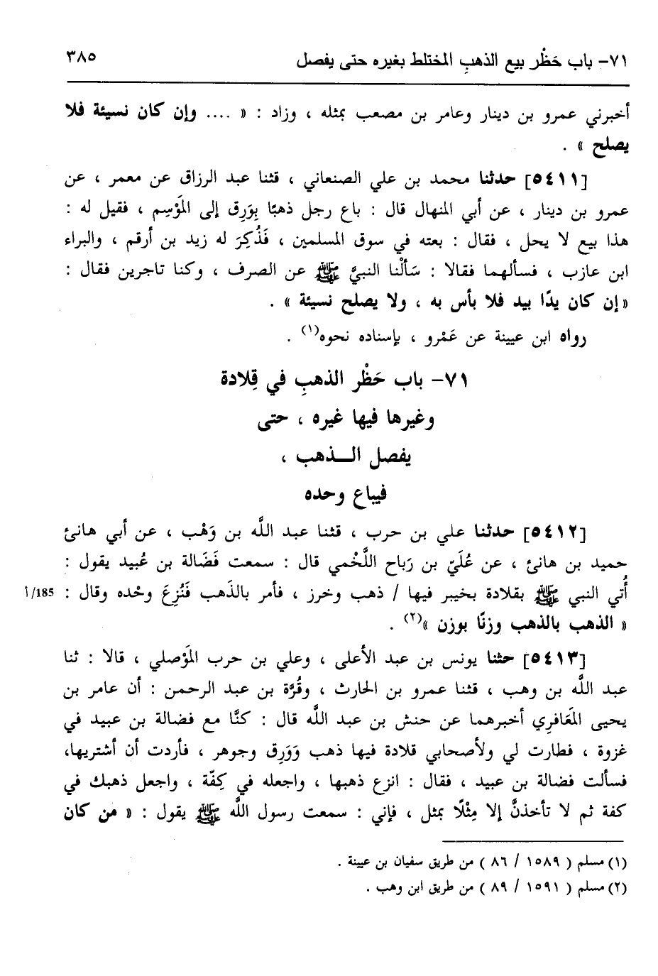 5413 - حثنا يُونُسُ بْنُ عَبْدِ الْأَعْلَى، وَعَلِيُّ بْنُ حَرْبٍ الْمَوْصِلِيُّ، قَالَا: ثَنَا عَبْدُ اللَّهِ بْنُ وَهْبٍ، قثنا عَمْرُو بْنُ الْحَارِثِ، وَقُرَّةُ بْنُ عَبْدِ الرَّحْمَنِ، أَنَّ عَامِرَ بْنَ يَحْيَى الْمَعَافِرِيَّ، أَخْبَرَهُمَا عَنْ حَنَشِ بْنِ عَبْدِ اللَّهِ، قَالَ: كُنَّا مَعَ فَضَالَةَ بْنِ عُبَيْدٍ فِي غَزْوَةٍ، فَطَارَتْ لِي وَلِأَصْحَابِي قِلَادَةٌ فِيهَا ذَهَبٌ، وَوَرِقٌ، وَجَوْهَرٌ، فَأَرَدْتُ أَنْ أَشْتَرِيَهَا، فَسَأَلْتُ فَضَالَةَ بْنَ عُبَيْدٍ، فَقَالَ: انْزِعْ ذَهَبَهَا وَاجْعَلْهُ فِي كِفَّةٍ، وَاجْعَلْ ذَهَبَكَ فِي كِفَّةٍ، ثُمَّ لَا تَأْخُذَنَّ إِلَّا مِثْلًا بِمِثْلٍ، فَإِنِّي سَمِعْتُ رَسُولَ اللَّهِ صَلَّى اللهُ عَلَيْهِ وَسَلَّمَ يَقُولُ: «§مَنْ كَانَ -[386]- يُؤْمِنُ بِاللَّهِ وَالْيَوْمِ الْآخِرِ، فَلَا يَأْخُذَنَّ إِلَّا مِثْلًا بِمِثْلٍ» ،